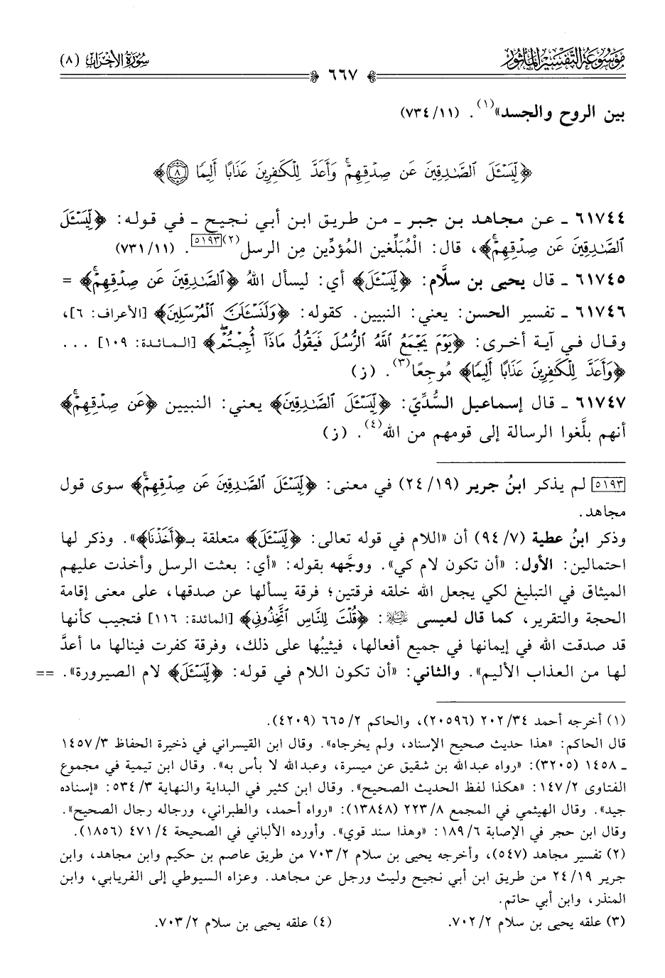 [٥١٩٣] لم يذكر ابنُ جرير (١٩/ ٢٤) في معنى: {لِيَسْأَلَ الصّادِقِينَ عَنْ صِدْقِهِمْ} سوى قول مجاهد.