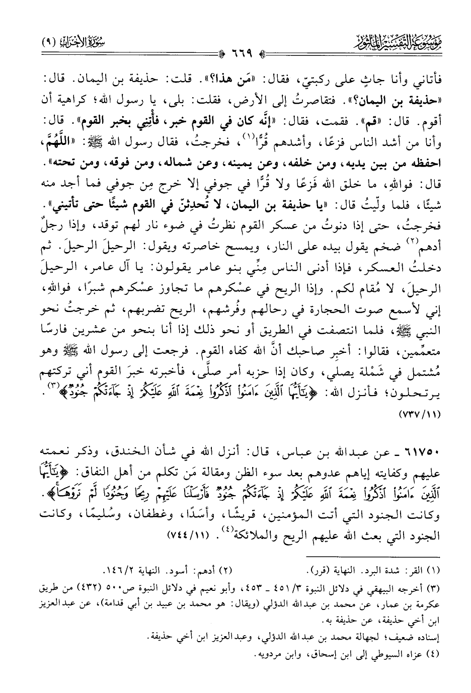 فأتاني وأنا جاثٍ على ركبتيّ، فقال: «مَن هذا؟». قلت: حذيفة بن اليمان. قال: «حذيفة بن اليمان؟». فتقاصرتُ إلى الأرض، فقلت: بلى، يا رسول الله؛ كراهية أن أقوم. قال: «قم». فقمت، فقال: «إنّه كان في القوم خبر، فأْتِنِي بخبر القوم». قال: وأنا من أشد الناس فزعًا، وأشدهم قُرًّا (¬١)، فخرجتُ، فقال رسول الله - صلى الله عليه وسلم -: «اللهم، احفظه من بين يديه، ومن خلفه، وعن يمينه، وعن شماله، ومن فوقه، ومن تحته». قال: فواللهِ، ما خلق الله فَزعًا ولا قُرًّا في جوفي إلا خرج مِن جوفي فما أجد منه شيئًا، فلما ولّيتُ قال: «يا حذيفة بن اليمان، لا تُحدِثنّ في القوم شيئا حتى تأتيني». فخرجتُ، حتى إذا دنوتُ من عسكر القوم نظرتُ في ضوء نار لهم توقد، وإذا رجلٌ أدهم (¬٢) ضخم يقول بيده على النار، ويمسح خاصرته ويقول: الرحيلَ الرحيلَ. ثم دخلتُ العسكر، فإذا أدنى الناس مِنِّي بنو عامر يقولون: يا آل عامر، الرحيلَ الرحيلَ، لا مُقام لكم. وإذا الريح في عسْكرهم ما تجاوز عسْكرهم شبرًا، فواللهِ، إني لأسمع صوت الحجارة في رحالهم وفُرشهم، الريح تضربهم، ثم خرجتُ نحو النبي - صلى الله عليه وسلم -، فلما انتصفت في الطريق أو نحو ذلك إذا أنا بنحو من عشرين فارسًا متعمِّمين، فقالوا: أخبِر صاحبك أنّ الله كفاه القوم. فرجعت إلى رسول الله - صلى الله عليه وسلم - وهو مُشتمل في شَمْلة يصلي، وكان إذا حزبه أمر صلّى، فأخبرته خبرَ القوم أني تركتهم يرتحلون؛ فأنزل الله: {يا أيُّها الَّذِينَ آمَنُوا اذْكُرُوا نِعْمَةَ اللَّهِ عَلَيْكُمْ إذْ جاءَتْكُمْ جُنُودٌ} (¬٣). (١١/ ٧٣٧)
