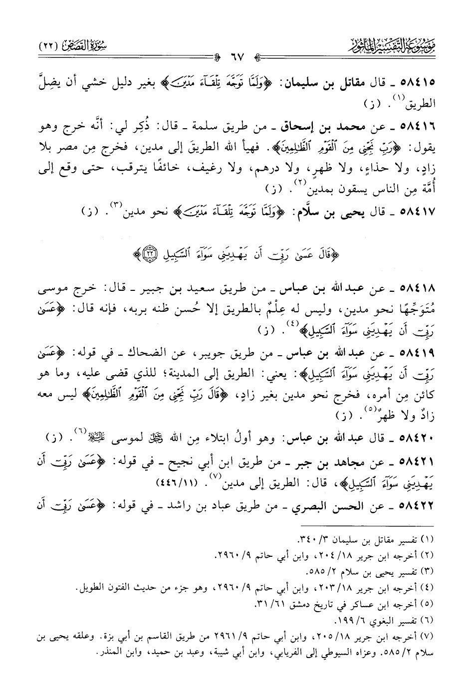 ٥٨٤٢١ - عن مجاهد بن جبر -من طريق ابن أبي نجيح- في قوله: {عسى ربي أن يهديني سواء السبيل}، قال: الطريق إلى مدين (¬٧). (١١/ ٤٤٦)