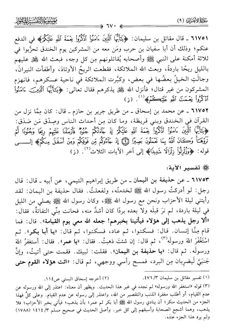 ٦١٧٥٢ - عن محمد بن إسحاق -من طريق جرير بن حازم- قال: كان مِمّا نزل من القرآن في الخندق وبني قريظة، وما كان مِن أحداث الناس وصِدْق مَن صَدَق: {يا أيها الذين ءامنوا اذكروا نعمة الله عليكم إذ جاءتكم جنود فأرسلنا عليهم ريحا وجنودا لم تروها وكان الله بما تعملون بصيرا إذ جاءوكم من فوقكم ومن أسفل منكم} إلى قوله: {وزلزلوا زلزالا شديدا} إلى آخر الآيات الثلاث (¬٢). (ز)