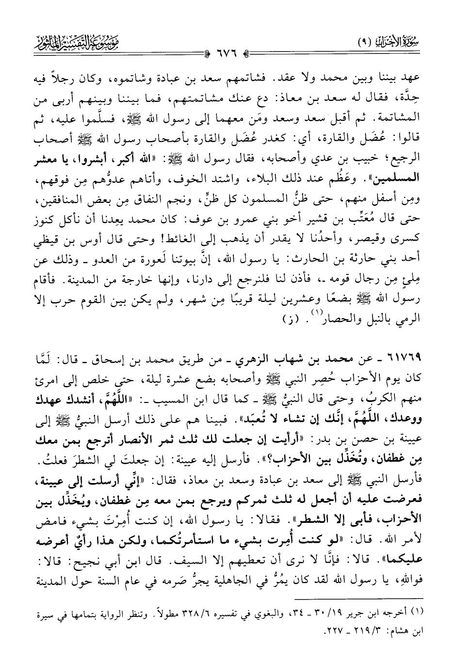 ٦١٧٦٩ - عن محمد بن شهاب الزهري -من طريق محمد ابن إسحاق- قال: لَمّا كان يوم الأحزاب حُصِر النبي - صلى الله عليه وسلم - وأصحابه بضع عشرة ليلة، حتى خلص إلى امرئ منهم الكربُ، وحتى قال النبيُّ - صلى الله عليه وسلم - -كما قال ابن المسيب-: «اللهم، أنشدك عهدك ووعدك، اللهم، إنّك إن تشاء لا تُعبَد». فبينا هم على ذلك أرسل النبيُّ - صلى الله عليه وسلم - إلى عيينة بن حصن بن بدر: «أرأيت إن جعلت لك ثلث ثمر الأنصار أترجع بمن معك مِن غطفان، وتُخَذِّل بين الأحزاب؟». فأرسل إليه عيينة: إن جعلتَ لي الشطرَ فعلتُ. فأرسل النبي - صلى الله عليه وسلم - إلى سعد بن عبادة وسعد بن معاذ، فقال: «إنِّي أرسلت إلى عيينة، فعرضت عليه أن أجعل له ثلث ثمركم ويرجع بمن معه مِن غطفان، ويُخَذِّل بين الأحزاب، فأبى إلا الشطر». فقالا: يا رسول الله، إن كنت أُمِرْتَ بشيء فامض لأمر الله. قال: «لو كنت أُمِرت بشيء ما استأمرتُكما، ولكن هذا رأيٌ أعرضه عليكما». قالا: فإنّا لا نرى أن تعطيهم إلا السيف. قال ابن أبي نجيح: قالا: فواللهِ، يا رسول الله لقد كان يمُرُّ في الجاهلية يجرُّ صَرمه في عام السنة حول المدينة
