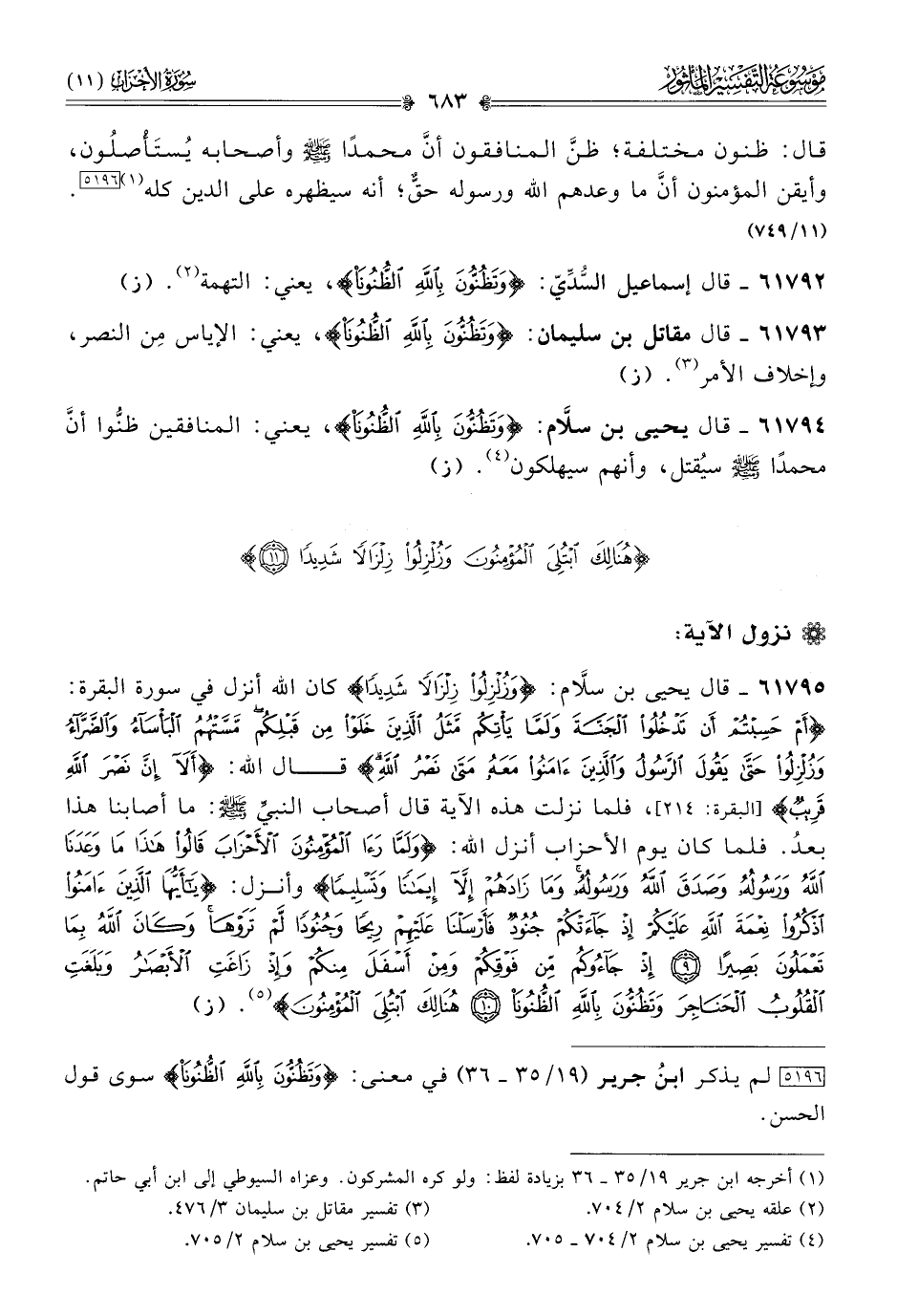 ٦١٧٩٥ - قال يحيى بن سلّام: {وزُلْزِلُوا زِلْزالًا شَدِيدًا} كان الله أنزل في سورة البقرة: {أمْ حَسِبْتُمْ أنْ تَدْخُلُوا الجَنَّةَ ولَمّا يَأْتِكُمْ مَثَلُ الَّذِينَ خَلَوْا مِن قَبْلِكُمْ مَسَّتْهُمُ البَأْساءُ والضَّرّاءُ وزُلْزِلُوا حَتّى يَقُولَ الرَّسُولُ والَّذِينَ آمَنُوا مَعَهُ مَتى نَصْرُ اللَّهِ} قال الله: {ألا إنَّ نَصْرَ اللَّهِ قَرِيبٌ} [البقرة: ٢١٤]، فلما نزلت هذه الآية قال أصحاب النبيِّ - صلى الله عليه وسلم -: ما أصابنا هذا بعدُ. فلما كان يوم الأحزاب أنزل الله: {ولَمّا رَأى المُؤْمِنُونَ الأَحْزابَ قالُوا هَذا ما وعَدَنا اللَّهُ ورَسُولُهُ وصَدَقَ اللَّهُ ورَسُولُهُ وما زادَهُمْ إلّا إيمانًا وتَسْلِيمًا} وأنزل: {يا أيُّها الَّذِينَ آمَنُوا اذْكُرُوا نِعْمَةَ اللَّهِ عَلَيْكُمْ إذْ جاءَتْكُمْ جُنُودٌ فَأَرْسَلْنا عَلَيْهِمْ رِيحًا وجُنُودًا لَمْ تَرَوْها وكانَ اللَّهُ بِما تَعْمَلُونَ بَصِيرًا * إذْ جاءُوكُمْ مِن فَوْقِكُمْ ومِن أسْفَلَ مِنكُمْ وإذْ زاغَتِ الأَبْصارُ وبَلَغَتِ القُلُوبُ الحَناجِرَ وتَظُنُّونَ بِاللَّهِ الظُّنُونا * هُنالِكَ ابْتُلِيَ المُؤْمِنُونَ} (¬٥). (ز)