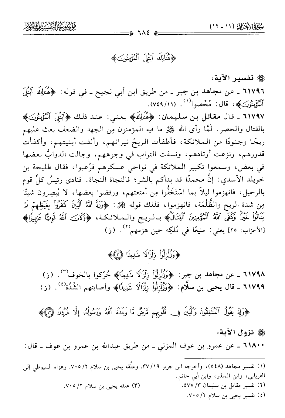 ٦١٧٩٦ - عن مجاهد بن جبر -من طريق ابن أبي نجيح- في قوله: {هُنالِكَ ابْتُلِيَ المُؤْمِنُونَ}، قال: مُحِّصوا (¬١). (١١/ ٧٤٩). (١١/ ٧٤٩)