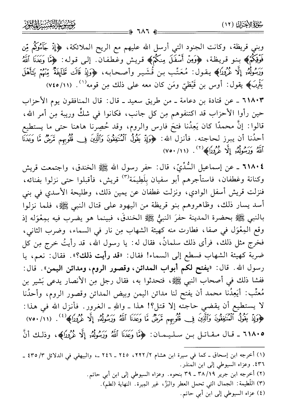 ٦١٨٠٤ - عن إسماعيل السُّدِّيّ، قال: حفر رسول الله - صلى الله عليه وسلم - الخندق، واجتمعت قريش وكنانة وغطفان، فاستأجرهم أبو سفيان بِلَطِيمَة (¬٣) قريش، فأقبلوا حتى نزلوا بفنائه، فنزلت قريش أسفل الوادي، ونزلت غطفان عن يمين ذلك، وطليحة الأسدي في بني أسد يسار ذلك، وظاهروهم بنو قريظة من اليهود على قتال النبي - صلى الله عليه وسلم -، فلما نزلوا بالنبي - صلى الله عليه وسلم - بحضرة المدينة حفرَ النبيُّ - صلى الله عليه وسلم - الخندقَ، فبينما هو يضرب فيه بمِعْوَله إذ وقع المِعْوَل في صفا، فطارت منه كهيئة الشهاب مِن نار في السماء، وضرب الثاني، فخرج مثل ذلك، فرأى ذلك سلمانُ، فقال له: يا رسول الله، قد رأيتُ خرج مِن كل ضربة كهيئة الشهاب فسطع إلى السماء! فقال: «قد رأيت ذلك؟». فقال: نعم، يا رسول الله. قال: «يفتح لكم أبواب المدائن، وقصور الروم، ومدائن اليمن». قال: ففشا ذلك في أصحاب النبي - صلى الله عليه وسلم -، فتحدثوا به، فقال رجل مِن الأنصار يدعى بَشير بن مُعتِّب: أيَعِدُنا محمد أن يفتح لنا مدائن اليمن وبيض المدائن وقصور الروم، وأحدُنا لا يستطيع أن يقضي حاجته إلا قتل؟! هذا -واللهِ- الغرور. فأنزل الله في هذا: {وإذْ يَقُولُ المُنافِقُونَ والَّذِينَ فِي قُلُوبِهِمْ مَرَضٌ ما وعَدَنا اللَّهُ ورَسُولُهُ إلّا غُرُورًا} (¬٤). (١١/ ٧٥٠)