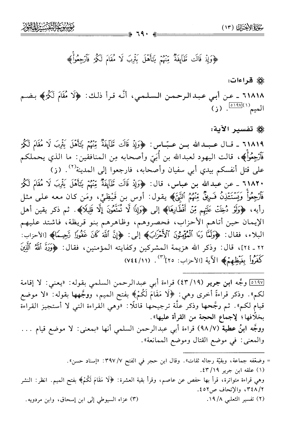 ٦١٨١٩ - قال عبد الله بن عبّاس: {وإذْ قالَتْ طائِفَةٌ مِنهُمْ يا أهْلَ يَثْرِبَ لا مُقامَ لَكُمْ فارْجِعُوا}، قالت اليهود لعبد الله بن أُبَيّ وأصحابه مِن المنافقين: ما الذي يحملكم على قتل أنفسكم بيدي أبي سفيان وأصحابه، فارجعوا إلى المدينة (¬٢). (ز)