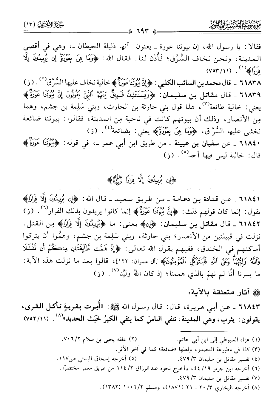 ٦١٨٤١ - عن قتادة بن دعامة -من طريق سعيد- قال الله: {إنْ يُرِيدُونَ إلّا فِرارًا} يقول: إنما كان قولهم ذلك: {إنَّ بُيُوتَنا عَوْرَةٌ} إنما كانوا يريدون بذلك الفرار (¬٦). (ز)