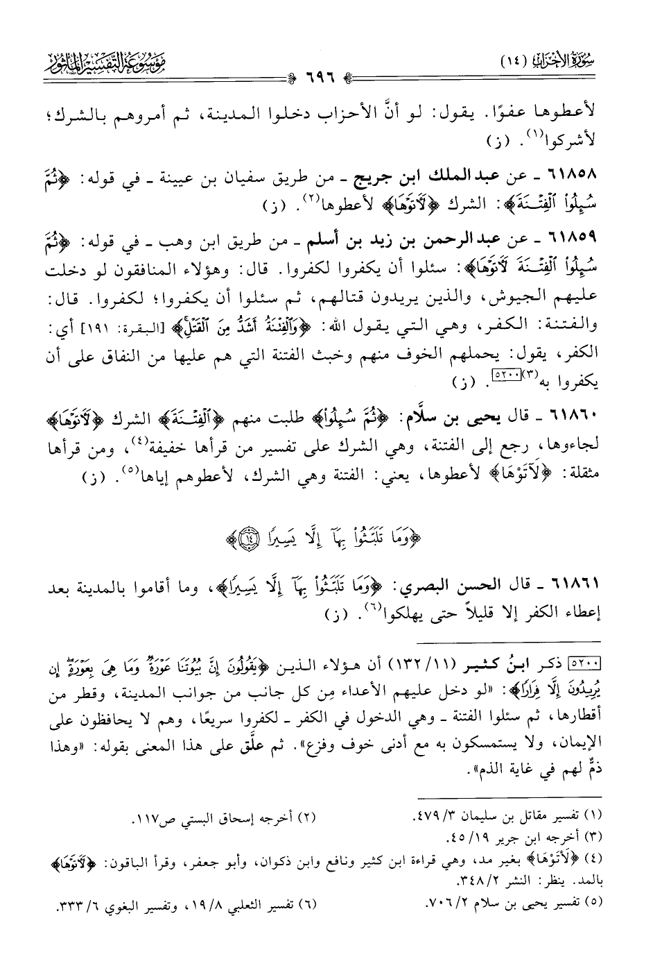 ٦١٨٦٠ - قال يحيى بن سلّام: {ثُمَّ سُئِلُوا} طلبت منهم {الفتنة} الشرك «لَأتَوْها» لجاءوها، رجع إلى الفتنة، وهي الشرك على تفسير من قرأها خفيفة (¬٤)، ومن قرأها مثقلة: {لَآتَوْها} لأعطوها، يعني: الفتنة وهي الشرك، لأعطوهم إياها (¬٥). (ز)