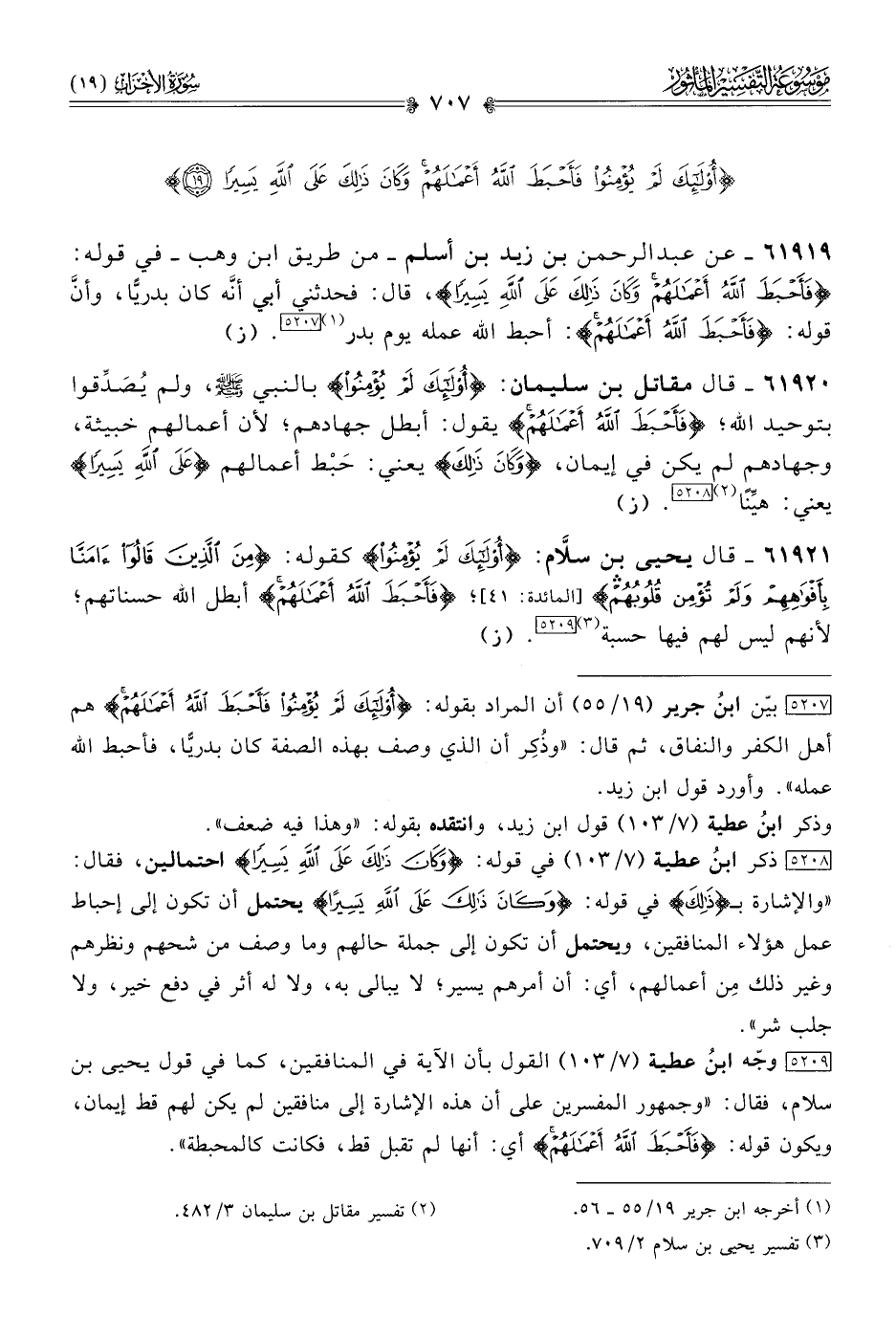 [٥٢٠٧] بيّن ابنُ جرير (١٩/ ٥٥) أن المراد بقوله: {أولئك لم يؤمنوا فأحبط الله أعمالهم} هم أهل الكفر والنفاق، ثم قال: «وذُكِر أن الذي وصف بهذه الصفة كان بدريًّا، فأحبط الله عمله». وأورد قول ابن زيد.