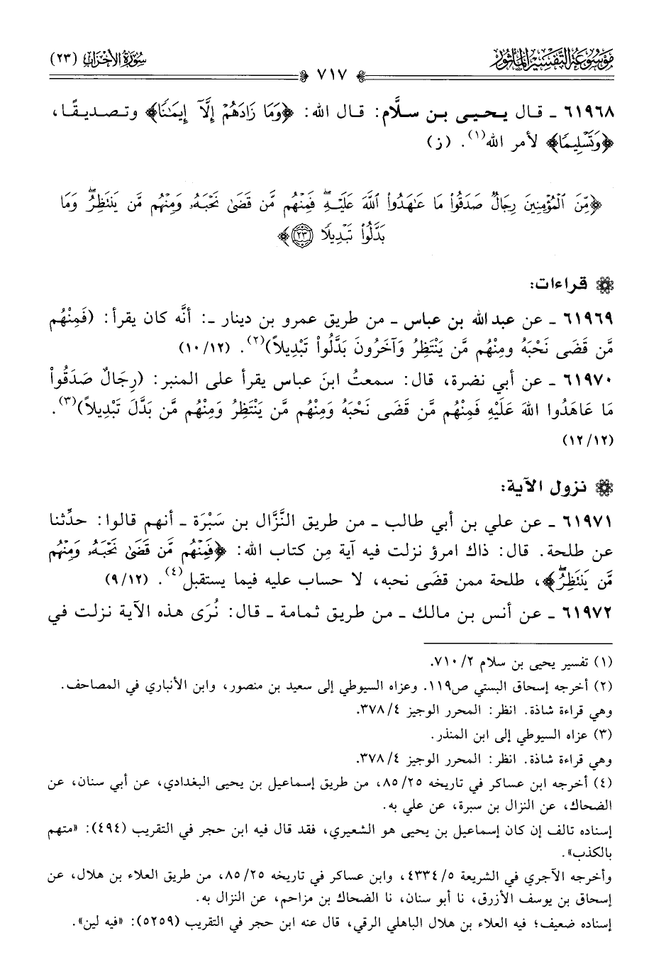 ٦١٩٦٩ - عن عبد الله بن عباس -من طريق عمرو بن دينار- أنّه كان يقرأ: (فَمِنهُم مَّن قَضى نَحْبَهُ ومِنهُم مَّن يَنْتَظِرُ وآخَرُونَ بَدَّلُواْ تَبْدِيلًا) (¬٢). (١٢/ ١٠)