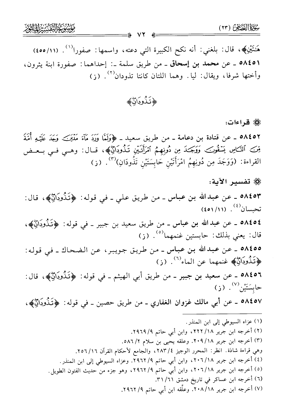 ٥٨٤٥٢ - عن قتادة بن دعامة -من طريق سعيد- {ولَمّا ورَدَ مَآءَ مَدْيَنَ وجَدَ عَلَيْهِ أُمَّةً مِّنَ النّاسِ يَسْقُونَ ووَجَدَ مِن دُونِهِمُ امْرَأَتَيْنِ تَذُودانِ}، قال: وهي في بعض القراءة: (ووَجَدَ مِن دُونِهِمُ امْرَأَتَيْنِ حابِسَتَيْنِ تَذُودانِ) (¬٣). (ز)