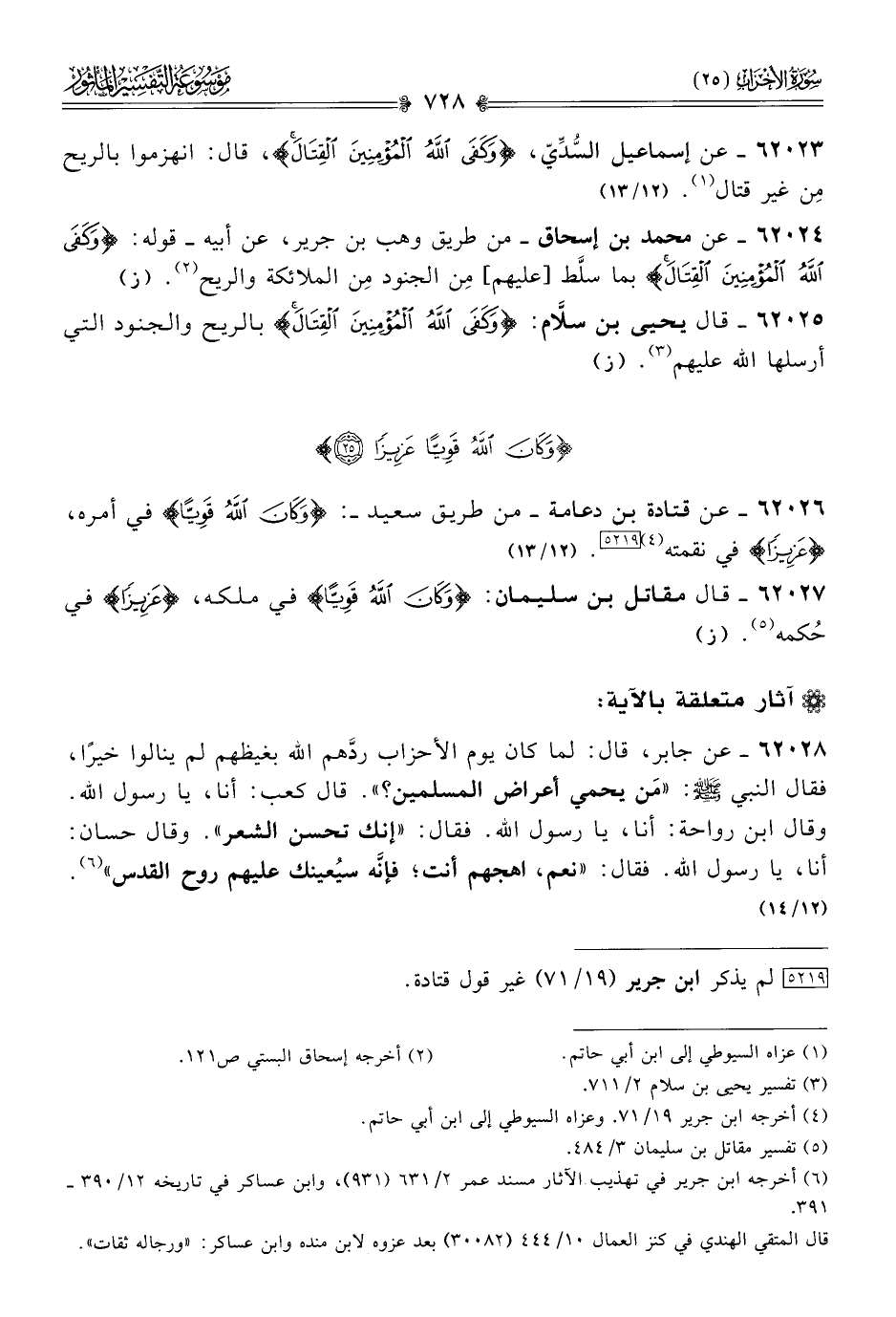 ٦٢٠٢٥ - قال يحيى بن سلّام: {وكَفى اللَّهُ المُؤْمِنِينَ القِتالَ} بالريح والجنود التي أرسلها الله عليهم (¬٣). (ز)