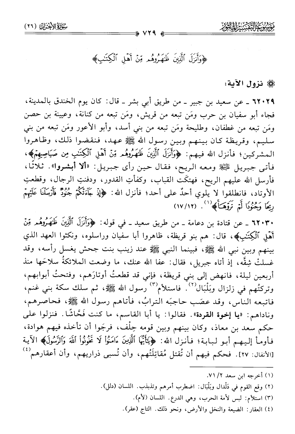 ٦٢٠٣٠ - عن قتادة بن دعامة -من طريق سعيد- في قوله: {وأَنْزَلَ الَّذِينَ ظاهَرُوهُمْ مِن أهْلِ الكِتابِ}، قال: هم بنو قريظة، ظاهروا أبا سفيان وراسلوه، ونكثوا العهد الذي بينهم وبين نبي الله - صلى الله عليه وسلم -، فبينما النبي - صلى الله عليه وسلم - عند زينب بنت جحش يغسل رأسه، وقد غسلتْ شِقَّه، إذ أتاه جبريل، فقال: عفا الله عنك، ما وضعت الملائكةُ سلاحَها منذ أربعين ليلة، فانهض إلى بني قريظة، فإني قد قطعتُ أوتارَهم، وفتحتُ أبوابهم، وتركتُهم في زلزال وبَلْبال (¬٢). فاستلأم (¬٣) رسول الله - صلى الله عليه وسلم -، ثم سلك سكة بني غنم، فاتبعه الناس، وقد عصَب حاجبَه الترابُ، فأتاهم رسول الله - صلى الله عليه وسلم -، فحاصرهم، وناداهم: «يا إخوة القردة». فقالوا: يا أبا القاسم، ما كنت فَحّاشًا. فنزلوا على حكم سعد بن معاذ، وكان بينهم وبين قومه حِلْف، فرجَوا أن تأخذه فيهم هوادة، فأومأ إليهم أبو لبابة؛ فأنزل الله: {يا أيُّها الَّذِينَ آمَنُوا لا تَخُونُوا اللَّهَ والرَّسُولَ} الآية [الأنفال: ٢٧]. فحكم فيهم أن تُقتل مقاتِلَتُهم، وأن تُسبى ذراريهم، وأن أعقارهم (¬٤)