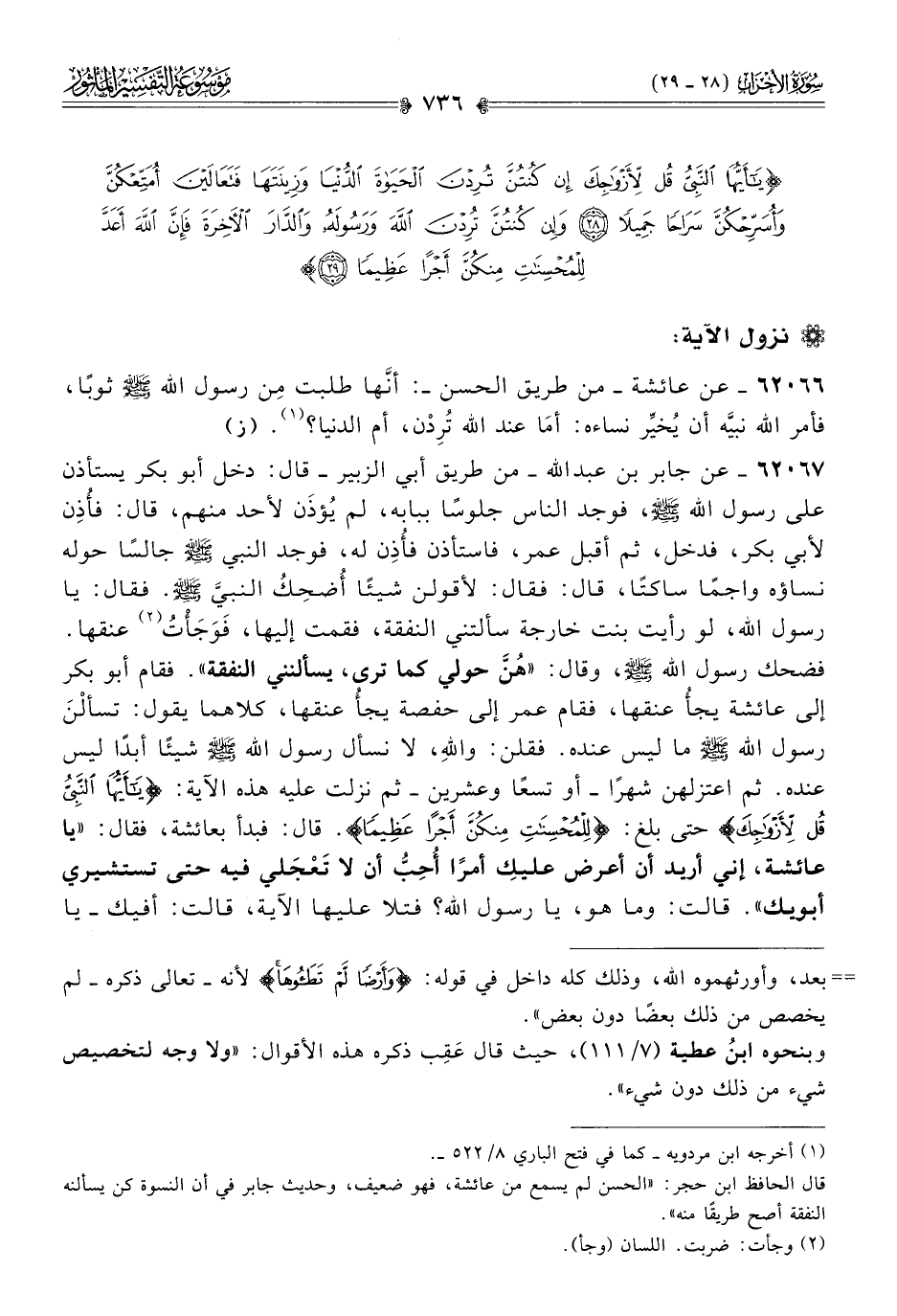 ٦٢٠٦٧ - عن جابر بن عبد الله -من طريق أبي الزبير- قال: دخل أبو بكر يستأذن على رسول الله - صلى الله عليه وسلم -، فوجد الناس جلوسًا ببابه، لم يُؤذَن لأحد منهم، قال: فأُذِن لأبي بكر، فدخل، ثم أقبل عمر، فاستأذن فأُذِن له، فوجد النبي - صلى الله عليه وسلم - جالسًا حوله نساؤه واجمًا ساكتًا، قال: فقال: لأقولن شيئًا أُضحِكُ النبيَّ - صلى الله عليه وسلم -. فقال: يا رسول الله، لو رأيت بنت خارجة سألتني النفقة، فقمت إليها، فَوَجَأْتُ (¬٢) عنقها. فضحك رسول الله - صلى الله عليه وسلم -، وقال: «هُنَّ حولي كما ترى، يسألنني النفقة». فقام أبو بكر إلى عائشة يجأُ عنقها، فقام عمر إلى حفصة يجأُ عنقها، كلاهما يقول: تسألْنَ رسول الله - صلى الله عليه وسلم - ما ليس عنده. فقلن: واللهِ، لا نسأل رسول الله - صلى الله عليه وسلم - شيئًا أبدًا ليس عنده. ثم اعتزلهن شهرًا -أو تسعًا وعشرين- ثم نزلت عليه هذه الآية: {يا أيها النبي قل لأزواجك} حتى بلغ: {للمحسنات منكن أجرا عظيما}. قال: فبدأ بعائشة، فقال: «يا عائشة، إني أريد أن أعرض عليكِ أمرًا أُحِبُّ أن لا تَعْجَلي فيه حتى تستشيري أبويك». قالت: وما هو، يا رسول الله؟ فتلا عليها الآية، قالت: أفيك -يا