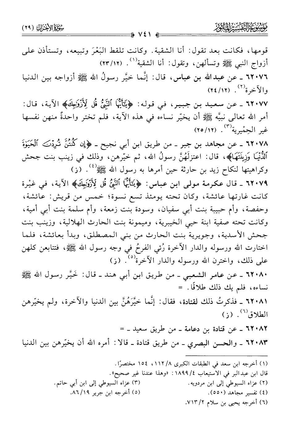 ٦٢٠٧٩ - قال عكرمة مولى ابن عباس {يا أيُّها النبي قُلْ لِأَزْواجِكَ} الآية، في غيْرة كانت غارتها عائشة، وكان تحته يومئذ تسع نسوة؛ خمس من قريش: عائشة، وحفصة، وأم حبيبة بنت أبي سفيان، وسودة بنت زمعة، وأم سلمة بنت أبي أمية، وكانت تحته صفية ابنة حيي الخيبرية، وميمونة بنت الحارث الهلالية، وزينب بنت جحش الأسدية، وجويرية بنت الحارث من بني المصطلق، وبدأ بعائشة، فلما اختارت الله ورسوله والدار الآخرة رُئي الفرحُ في وجه رسول الله - صلى الله عليه وسلم -، فتتابعن كلهن على ذلك، واخترن الله ورسوله والدار الآخرة (¬٥). (ز)