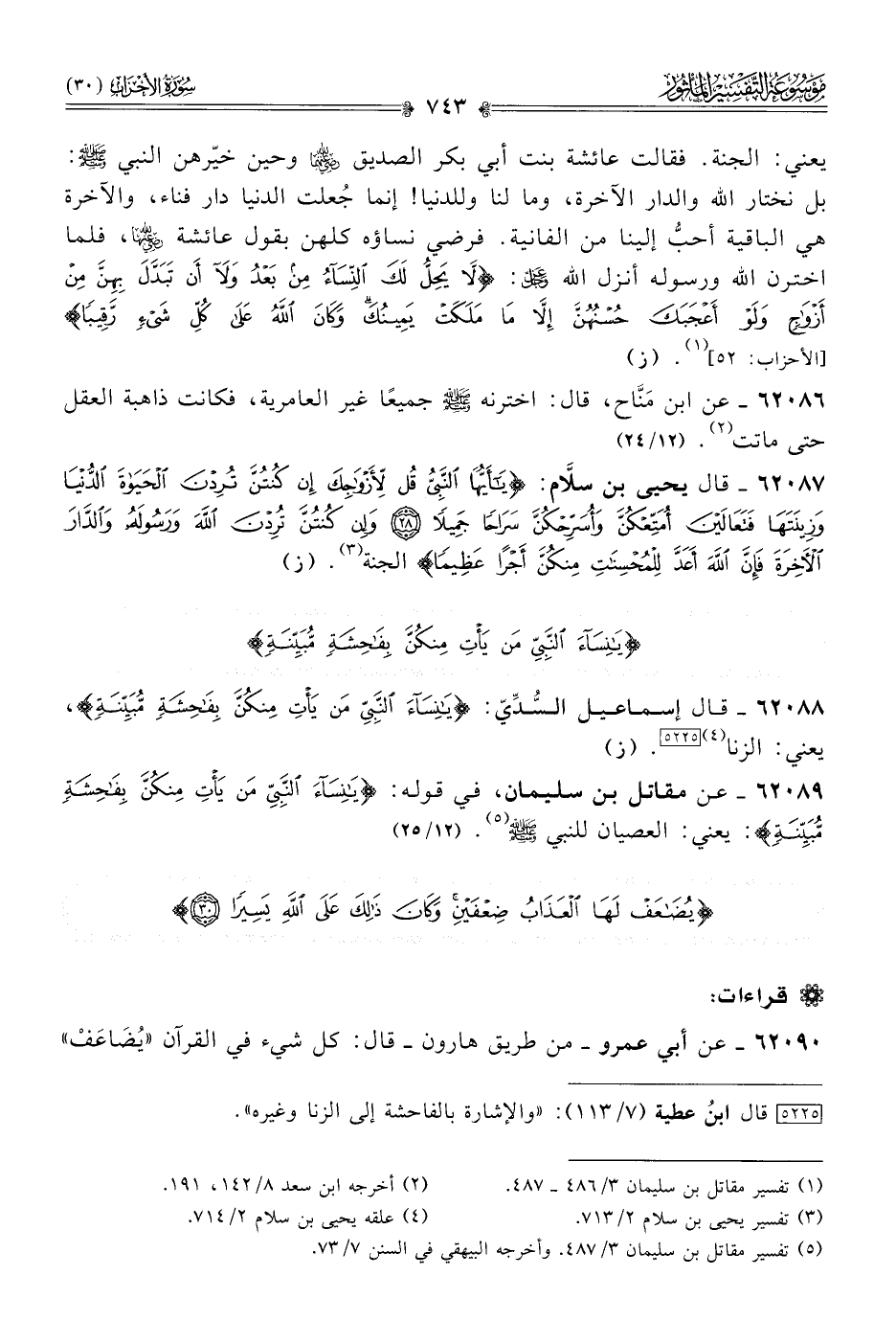 ٦٢٠٨٧ - قال يحيى بن سلّام: {يا أيُّها النبي قُلْ لِأَزْواجِكَ إنْ كُنْتُنَّ تُرِدْنَ الحَياةَ الدُّنْيا وزِينَتَها فَتَعالَيْنَ أُمَتِّعْكُنَّ وأُسَرِّحْكُنَّ سَراحًا جَمِيلًا * وإنْ كُنْتُنَّ تُرِدْنَ اللَّهَ ورَسُولَهُ والدّارَ الآخِرَةَ فَإنَّ اللَّهَ أعَدَّ لِلْمُحْسِناتِ مِنكُنَّ أجْرًا عَظِيمًا} الجنة (¬٣). (ز)
