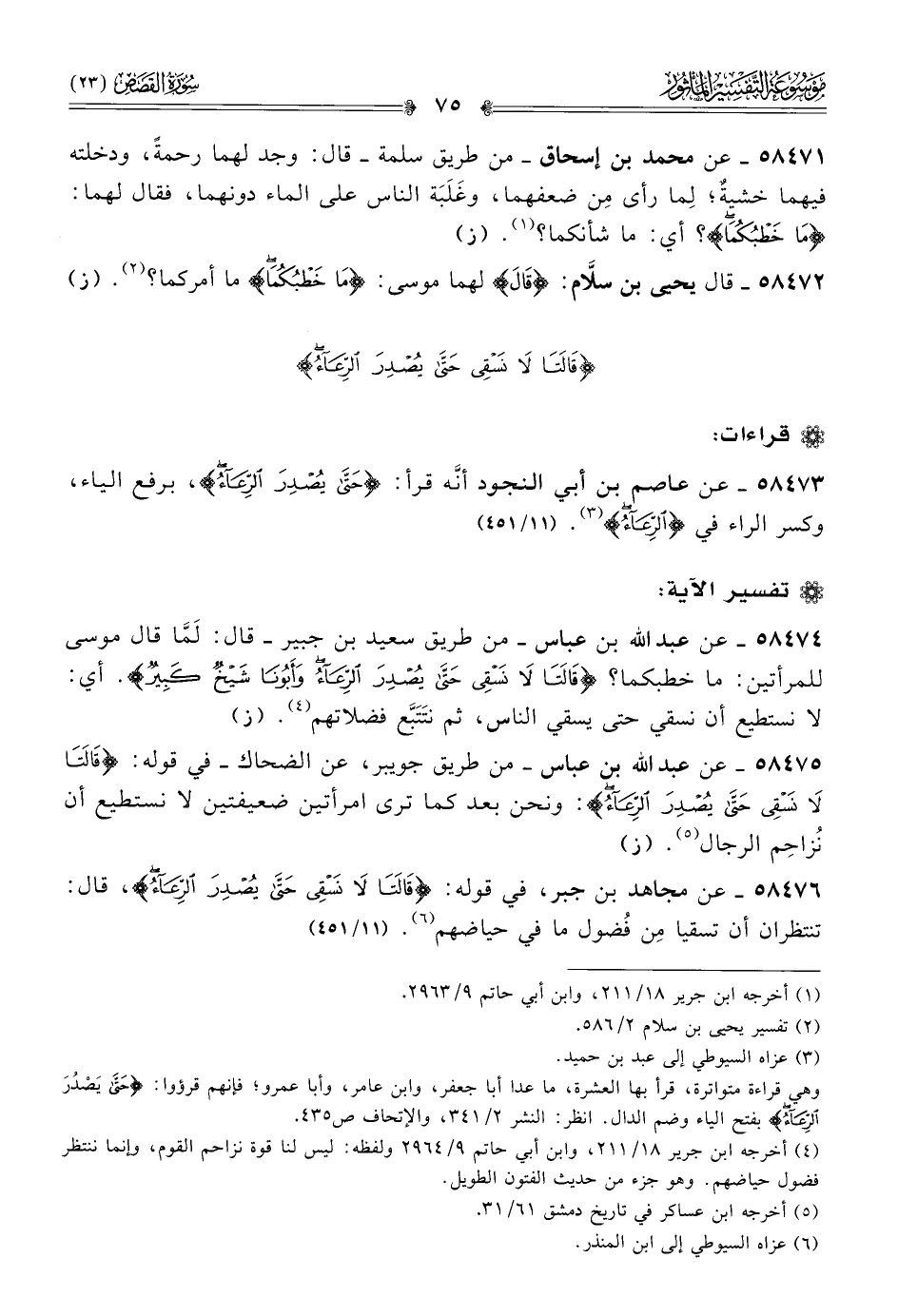 ٥٨٤٧٤ - عن عبد الله بن عباس -من طريق سعيد بن جبير- قال: لَمّا قال موسى للمرأتين: ما خطبكما؟ {قالتا لا نسقي حتى يصدر الرعاء وأبونا شيخ كبير}. أي: لا نستطيع أن نسقي حتى يسقي الناس، ثم نتَتَبَّع فضلاتهم (¬٤). (ز)