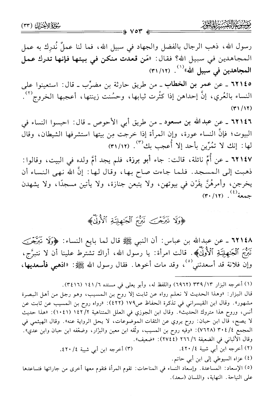 ٦٢١٤٦ - عن عبد الله بن مسعود -من طريق أبي الأحوص- قال: احبسوا النساء في البيوت؛ فإنّ النساء عورة، وإن المرأة إذا خرجت مِن بيتها استشرفها الشيطان، وقال لها: إنك لا تمُرِّين بأحد إلا أُعجب بك (¬٣). (١٢/ ٣١)