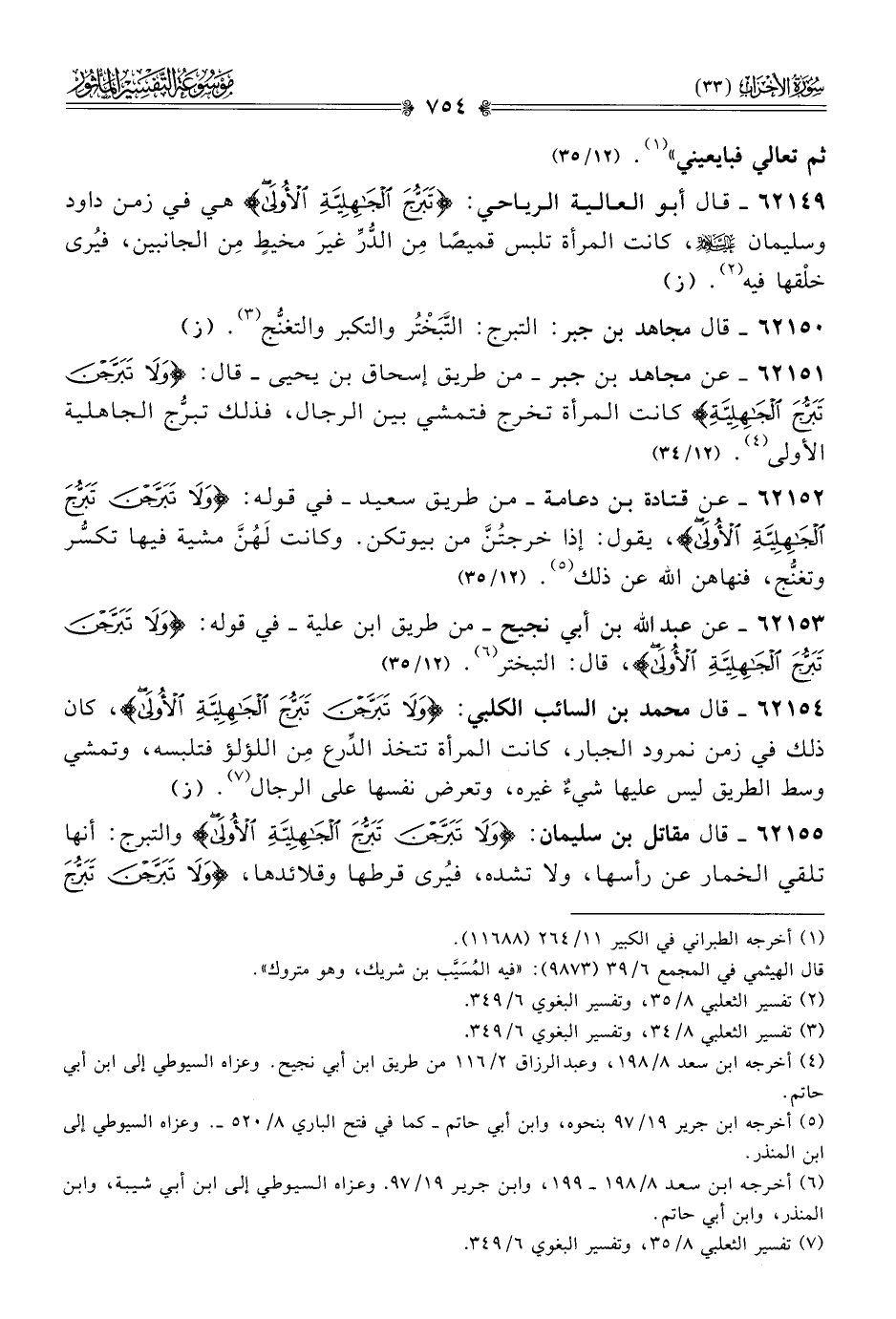 ٦٢١٤٩ - قال أبو العالية الرياحي: {تَبَرُّجَ الجاهِلِيَّةِ الأُولى} هي في زمن داود وسليمان?، كانت المرأة تلبس قميصًا مِن الدُّرِّ غيرَ مخيطٍ مِن الجانبين، فيُرى خلْقها فيه (¬٢). (ز)