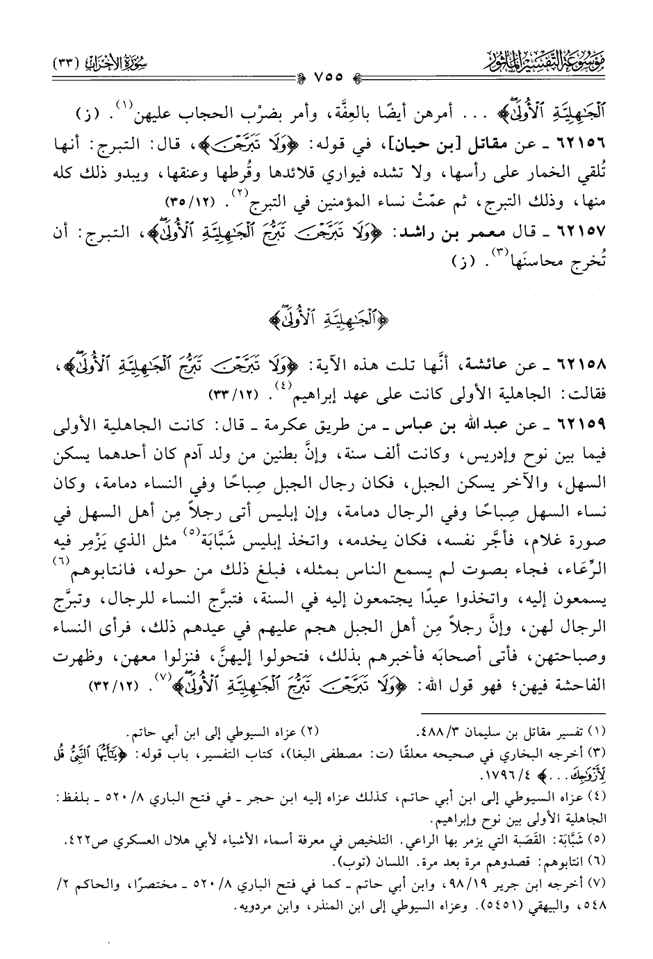 ٦٢١٥٨ - عن عائشة، أنّها تلت هذه الآية: {ولا تَبَرَّجْنَ تَبَرُّجَ الجاهِلِيَّةِ الأُولى}، فقالت: الجاهلية الأولى كانت على عهد إبراهيم (¬٤). (١٢/ ٣٣)