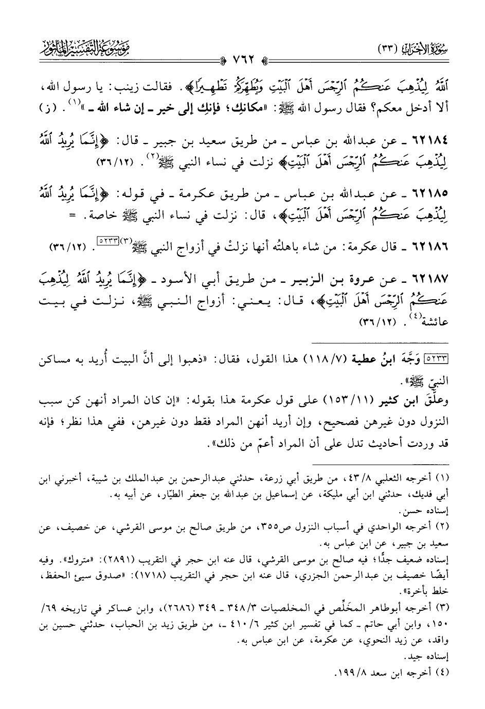 ٦٢١٨٤ - عن عبد الله بن عباس -من طريق سعيد بن جبير- قال: {إنَّما يُرِيدُ اللَّهُ لِيُذْهِبَ عَنْكُمُ الرِّجْسَ أهْلَ البَيْتِ} نزلت في نساء النبي - صلى الله عليه وسلم - (¬٢). (١٢/ ٣٦)
