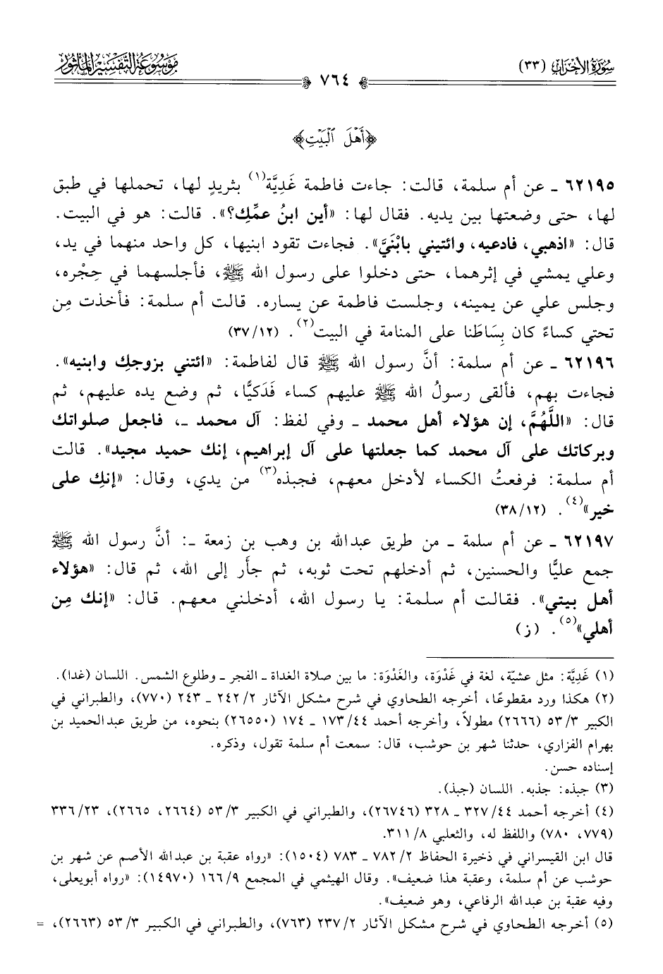 ٦٢١٩٦ - عن أم سلمة: أنّ رسول الله - صلى الله عليه وسلم - قال لفاطمة: «ائتني بزوجكِ وابنيه». فجاءت بهم، فألقى رسولُ الله - صلى الله عليه وسلم - عليهم كساء فَدَكيًّا، ثم وضع يده عليهم، ثم قال: «اللهم، إن هؤلاء أهل محمد -وفي لفظ: آل محمد-، فاجعل صلواتك وبركاتك على آل محمد كما جعلتها على آل إبراهيم، إنك حميد مجيد». قالت أم سلمة: فرفعتُ الكساء لأدخل معهم، فجبذه (¬٣) من يدي، وقال: «إنكِ على خير» (¬٤). (١٢/ ٣٨)