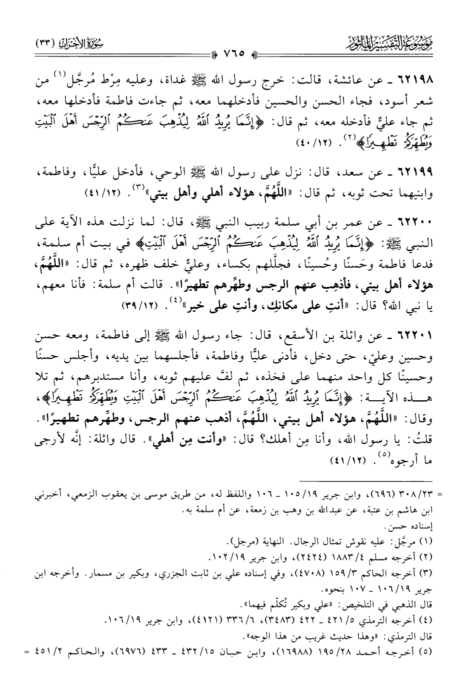 ٦٢١٩٨ - عن عائشة، قالت: خرج رسول الله - صلى الله عليه وسلم - غداة، وعليه مِرْط مُرجَّل (¬١) من شعر أسود، فجاء الحسن والحسين فأدخلهما معه، ثم جاءت فاطمة فأدخلها معه، ثم جاء عليٌّ فأدخله معه، ثم قال: {إنَّما يُرِيدُ اللَّهُ لِيُذْهِبَ عَنْكُمُ الرِّجْسَ أهْلَ البَيْتِ ويُطَهِّرَكُمْ تطهيرًا} (¬٢). (١٢/ ٤٠)
