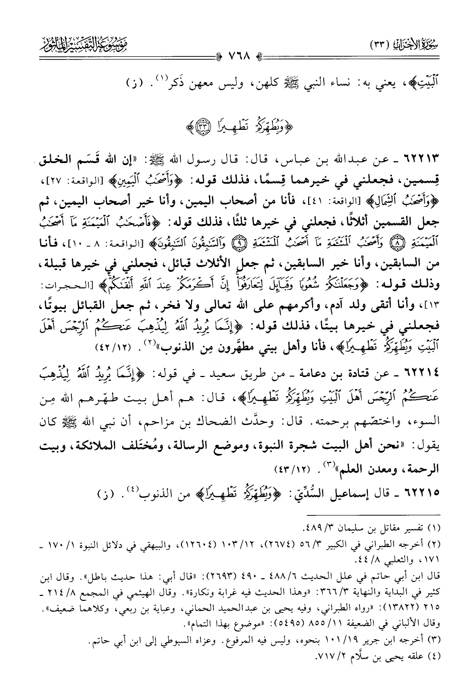 ٦٢٢١٣ - عن عبد الله بن عباس، قال: قال رسول الله - صلى الله عليه وسلم -: «إن الله قَسَم الخلق قِسمين، فجعلني في خيرهما قِسمًا، فذلك قوله: {وأَصْحابُ اليَمِينِ} [الواقعة: ٢٧]، {وأَصْحابُ الشِّمالِ} [الواقعة: ٤١]، فأنا من أصحاب اليمين، وأنا خير أصحاب اليمين، ثم جعل القسمين أثلاثًا، فجعلني في خيرها ثلثًا، فذلك قوله: {فَأَصْحابُ المَيْمَنَةِ ما أصْحابُ المَيْمَنَةِ * وأَصْحابُ المَشْأَمَةِ ما أصْحابُ المَشْأَمَةِ * والسّابِقُونَ السّابِقُونَ} [الواقعة: ٨ - ١٠]، فأنا من السابقين، وأنا خير السابقين، ثم جعل الأثلاث قبائل، فجعلني في خيرها قبيلة، وذلك قوله: {وجَعَلْناكُمْ شُعُوبًا وقَبائِلَ لِتَعارَفُوا إنَّ أكْرَمَكُمْ عِنْدَ اللَّهِ أتْقاكُمْ} [الحجرات: ١٣]، وأنا أتقى ولد آدم، وأكرمهم على الله تعالى ولا فخر، ثم جعل القبائل بيوتًا، فجعلني في خيرها بيتًا، فذلك قوله: {إنَّما يُرِيدُ اللَّهُ لِيُذْهِبَ عَنْكُمُ الرِّجْسَ أهْلَ البَيْتِ ويُطَهِّرَكُمْ تطهيرًا}، فأنا وأهل بيتي مطهَّرون مِن الذنوب» (¬٢). (١٢/ ٤٢)