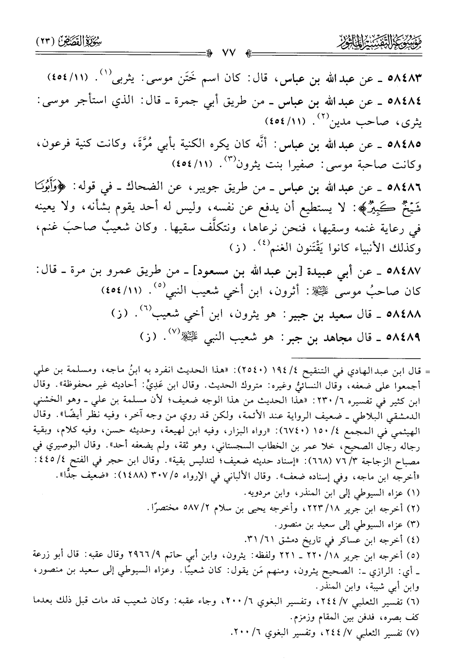٥٨٤٨٧ - عن أبي عبيدة [بن عبد الله بن مسعود]-من طريق عمرو بن مرة- قال: كان صاحبُ موسى - عليه السلام -: أثرون، ابن أخي شعيب النبي (¬٥). (١١/ ٤٥٤)