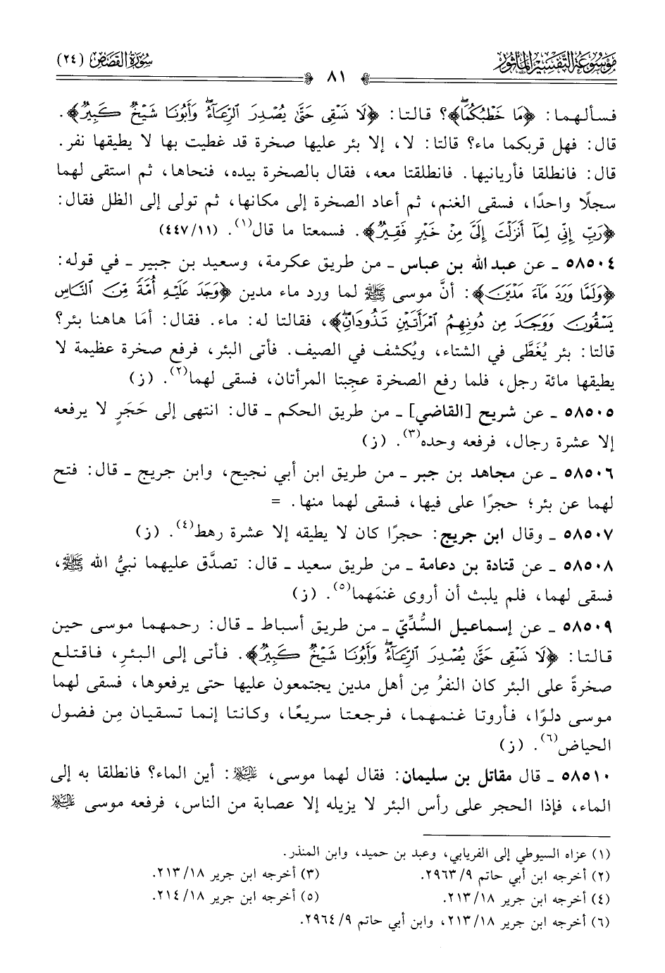 ٥٨٥١٠ - قال مقاتل بن سليمان: فقال لهما موسى، - عليه السلام -: أين الماء؟ فانطلقا به إلى الماء، فإذا الحجر على رأس البئر لا يزيله إلا عصابة من الناس، فرفعه موسى - عليه السلام -