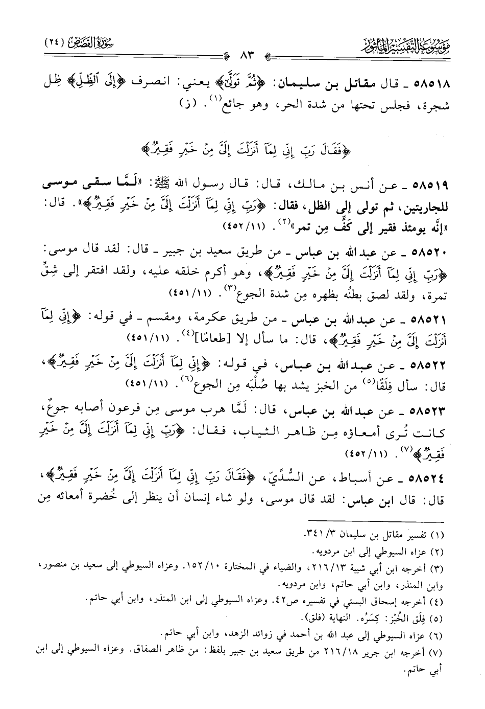 ٥٨٥٢٢ - عن عبد الله بن عباس، في قوله: {إني لما أنزلت إلي من خير فقير}، قال: سأل فِلَقًا (¬٥) من الخبز يشد بها صُلْبَه مِن الجوع (¬٦). (١١/ ٤٥١)