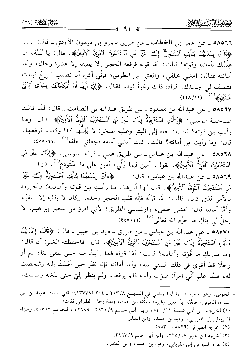 ٥٨٥٦٩ - عن عبد الله بن عباس، قال: ... {قالت احداهما يا أبت استأجره إن خير من استأجرت القوي الأمين}. قال لها أبوها: ما رأيتِ مِن قوته وأمانته؟ فأخبرته بالأمر الذي كان، قالت: أمّا قوَّتُه فإنّه قلب الحجر وحده، وكان لا يقلبه إلا النفرُ، وأَمّا أمانته قال: امشي خلفي، وأرشديني الطريقَ؛ لأني امرؤ مِن عنصر إبراهيم، لا يحلُّ لي مِنكِ ما حرَّم الله تعالى (¬٤). (١١/ ٤٤٧)