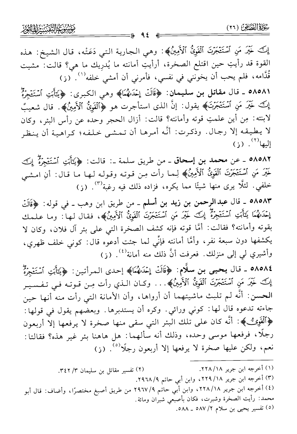 ٥٨٥٨٤ - قال يحيى بن سلّام: {قالت إحداهما} إحدى المرأتين: {يا أبت استأجره إن خير من استأجرت القوي الأمين} ... وكان الذي رأت مِن قوته في تفسير الحسن: أنّه لم تلبث ماشيتهما أن أرواها، وأن الأمانة التي رأت منه أنها حين جاءته تدعوه قال لها: كوني ورائي. وكره أن يستدبرها. وبعضهم يقول في قولها: {القوي}: أنّه كان على تلك البئر التي سقى منها صخرة لا يرفعها إلا أربعون رجلًا، فرفعها موسى وحده، وذلك أنه سألهما: هل هاهنا بئر غير هذه؟ فقالتا: نعم، ولكن عليها صخرة لا يرفعها إلا أربعون رجلًا (¬٥). (ز)