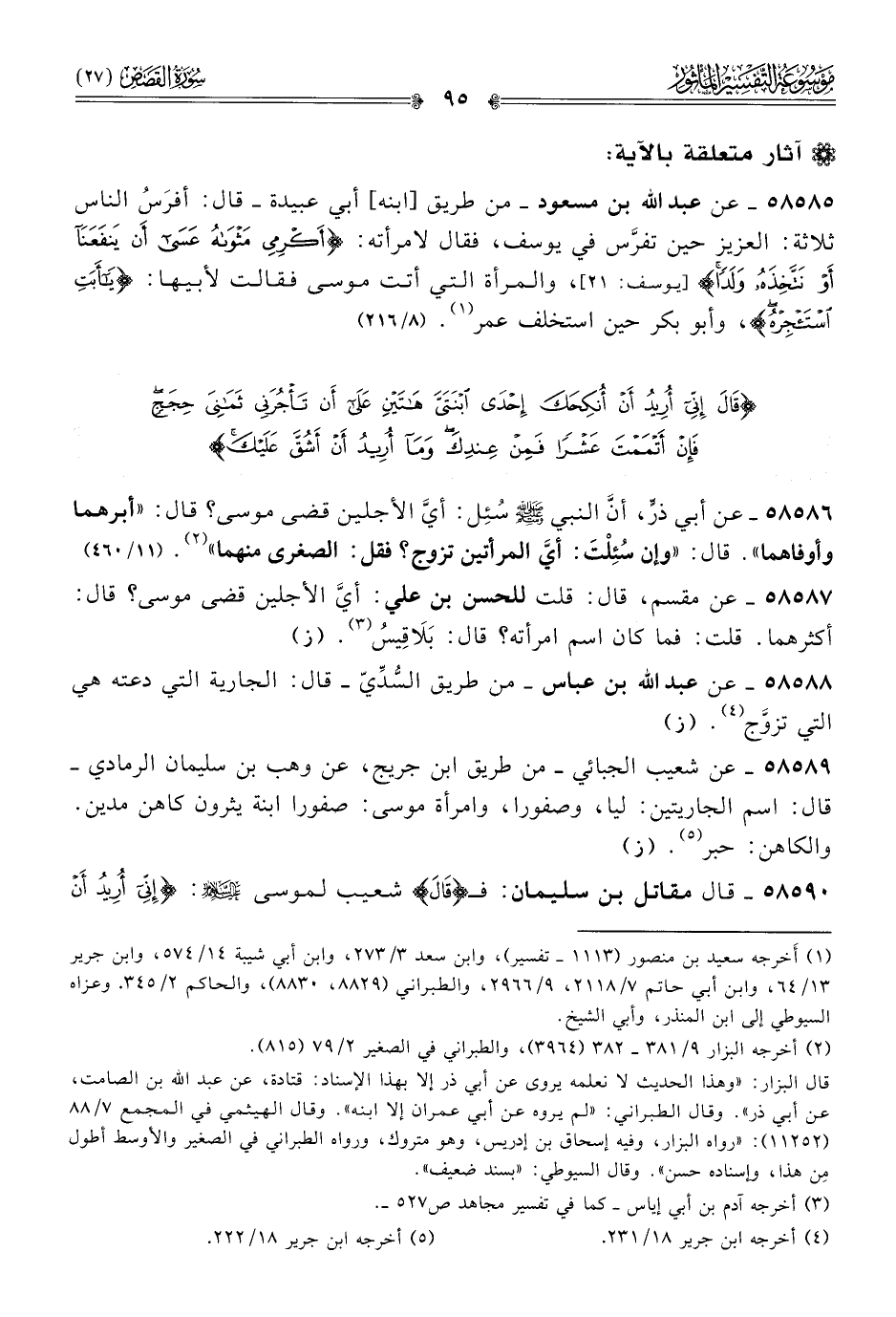 ٥٨٥٨٦ - عن أبي ذرٍّ، أنّ النبي - صلى الله عليه وسلم - سُئِل: أيَّ الأجلين قضى موسى؟ قال: «أبرهما وأوفاهما». قال: «وإن سُئِلْتَ: أيَّ المرأتين تزوج؟ فقل: الصغرى منهما» (¬٢). (١١/ ٤٦٠)