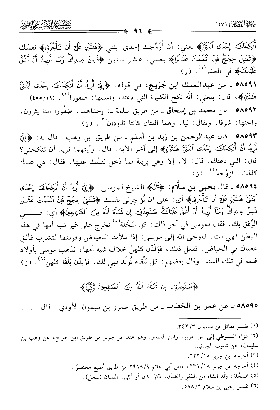 ٥٨٥٩١ - عن عبد الملك ابن جُرَيج، في قوله: {إني أريد أن أنكحك إحدى ابنتي هاتين}، قال: بلغني: أنّه نكح الكبيرة التي دعته، واسمها: صفورا (¬٢). (١١/ ٤٥٥)