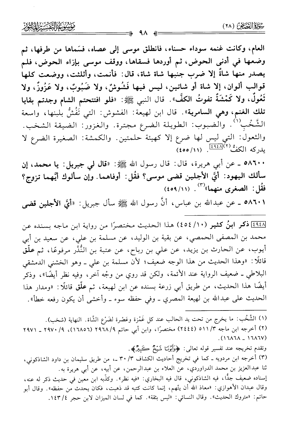 العام، وكانت غنمه سوداء حسناء، فانطلق موسى إلى عصاه، فسَماها من طرفها، ثم وضعها في أدنى الحوض، ثم أوردها فسقاها، ووقف موسى بإزاء الحوض، فلم يصدر منها شاةٌ إلا ضرب جنبها شاة شاة، قال: فأنمت، وأثلثت، ووضعت كلها قوالب ألوان، إلا شاة أو شاتين، ليس فيها فَشُوشٌ، ولا ضَبُوبٌ، ولا عَزُوزٌ، ولا ثَعُولٌ، ولا كَمْشَةٌ تفوتُ الكفَّ». قال النبي - صلى الله عليه وسلم -: «فلو افتتحتم الشام وجدتم بقايا تلك الغنم، وهي السامرية». قال ابن لهيعة: الفشوش: التي تَفُشُّ بلبنها، واسعة الشَّخْبِ (¬١). والضبوب: الطويلة الضرع مجترة. والغزور: الضيقة الشخب. والثعول: التي ليس لها ضرع إلا كهيئة حلمتين. والكمشة: الصغيرة الضرع لا يدركه الكفُّ (¬٢) [٤٩٤٨]. (١١/ ٤٥٥)