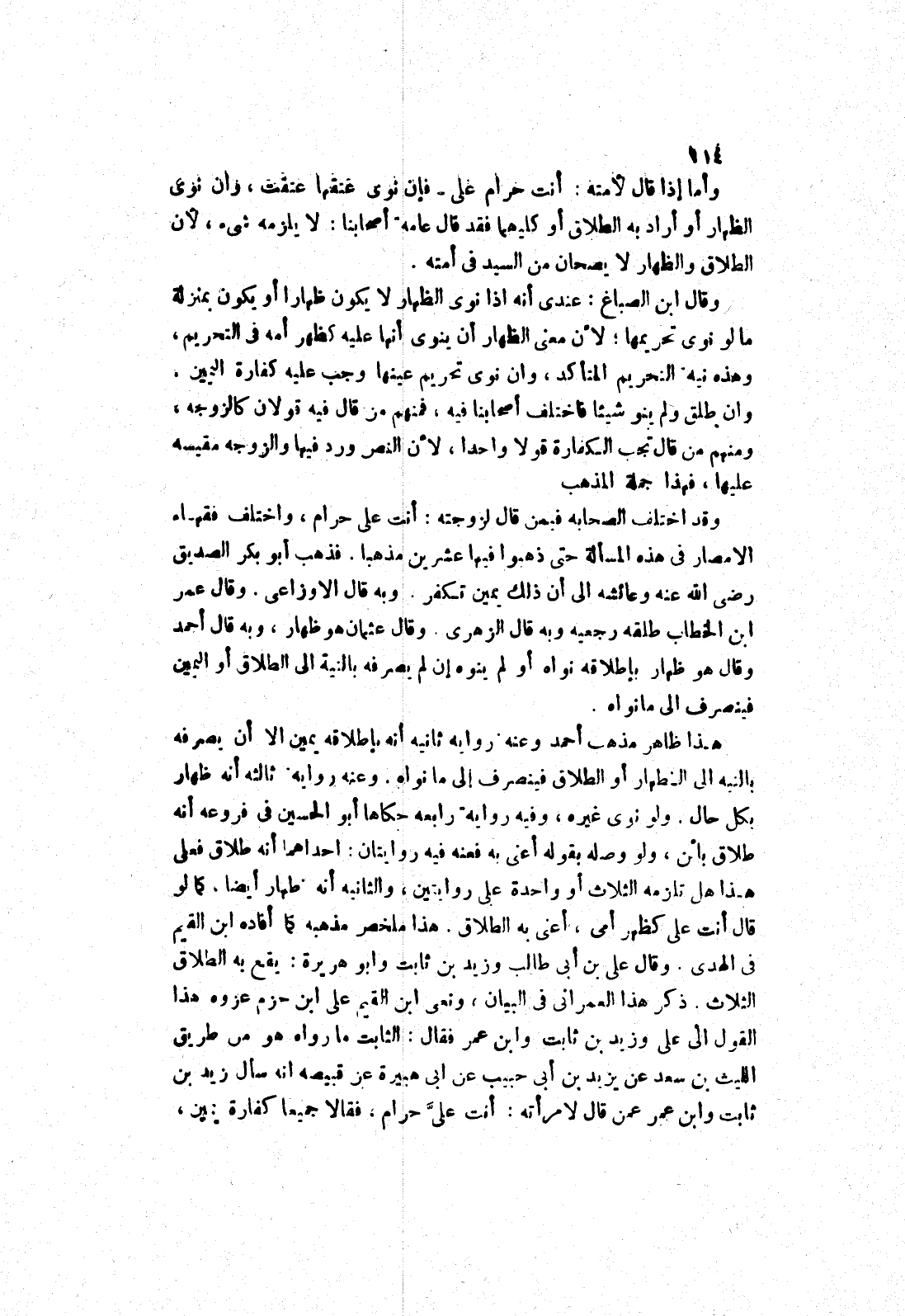 وان طلق ولم ينو شيئا فاختلف أصحابنا فيه، فمنهم من قال فيه قولان كالزوجه، ومنهم من قال تجب الكفارة قولا واحدا، لان النص ورود فيها والزوجه مقيسه عليها، فهذا جملة المذهب وقد اختلف الصحابة فيمن قال لزوجته: أنت على حرام، واختلف فقهاء الامصار في هذ المسألة حتى ذهبوا فيها عشرين مذهبا.