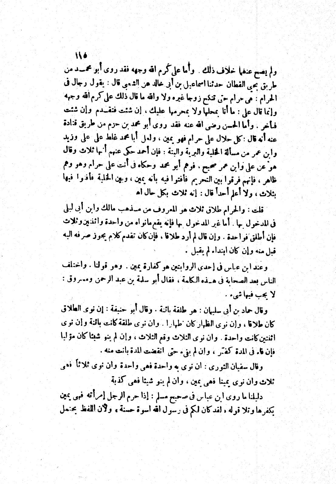 وأما على كرم الله وجهه فقد روى أبو محمد من طريق يحيى القطان حدثنا اسماعيل بن أبى خالد عن الشعبى قال: يقول رجال في الحرام: هي حرام حتى تنكح زوجا غيره ولا والله ما قال ذلك على كرم الله وجهه وإنما قال على: ما أنا بمحلها ولا بمحرمها عليك، إن شئت فتقدم وإن شئت فأخر.