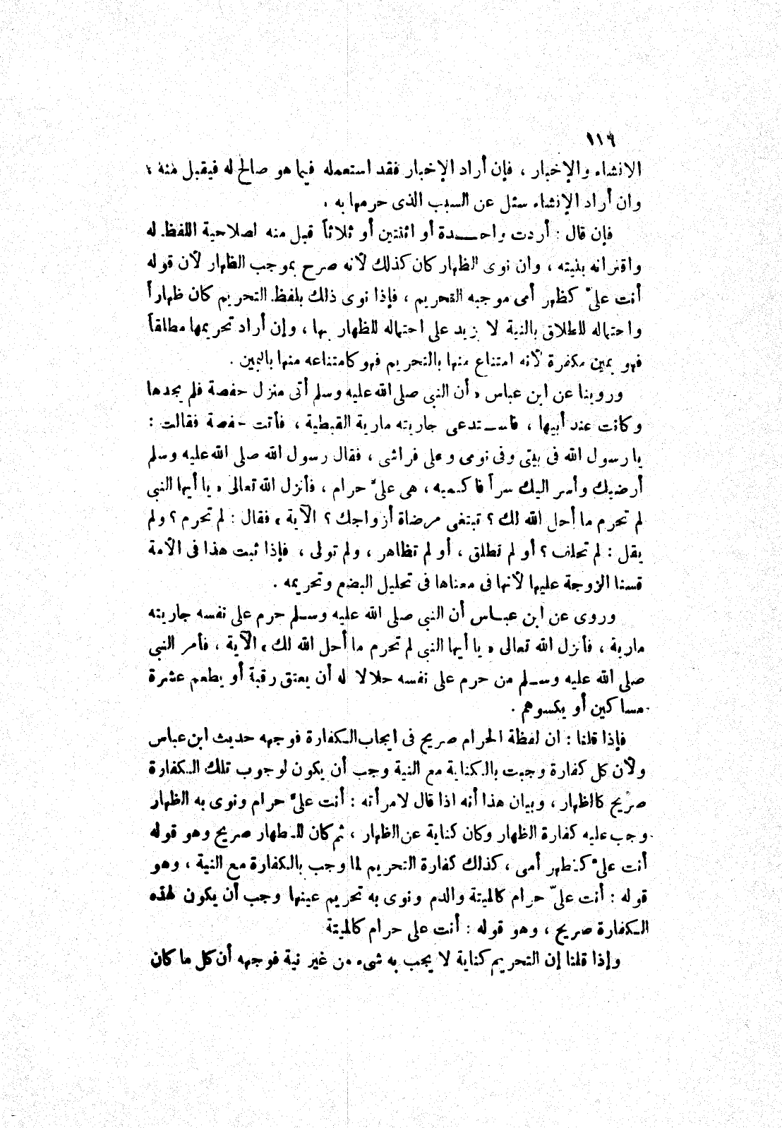 فإذا قلنا: ان لفظة الحرام صريح في ايجاب الكفارة فوجهه حديث ابن عباس ولان كل كفارة وجبت بالكناية مع النية وجب أن يكون لوجوب تلك الكفارة صريح كالظهار، وبيان هذا أنه إذا قال لامرأته: أنت على حرام ونوى به الظهار وجب عليه كفارة الظهار وكان كناية عن الظهار، ثم كان للظهار صريح وهو قوله أنت على كظهر أمي، كذلك كفارة التحريم لما وجب بالكفارة مع النية، وهو قوله: أنت على حرام كالميتة والدم ونوى به تحريم عينها وجب أن يكون لهذه الكفارة صريح، وهو قوله: أنت على حرام كالميتة وإذا قلنا إن التحريم كناية لا يجب به شئ من غير نية فوجهه أن كل ما كان
