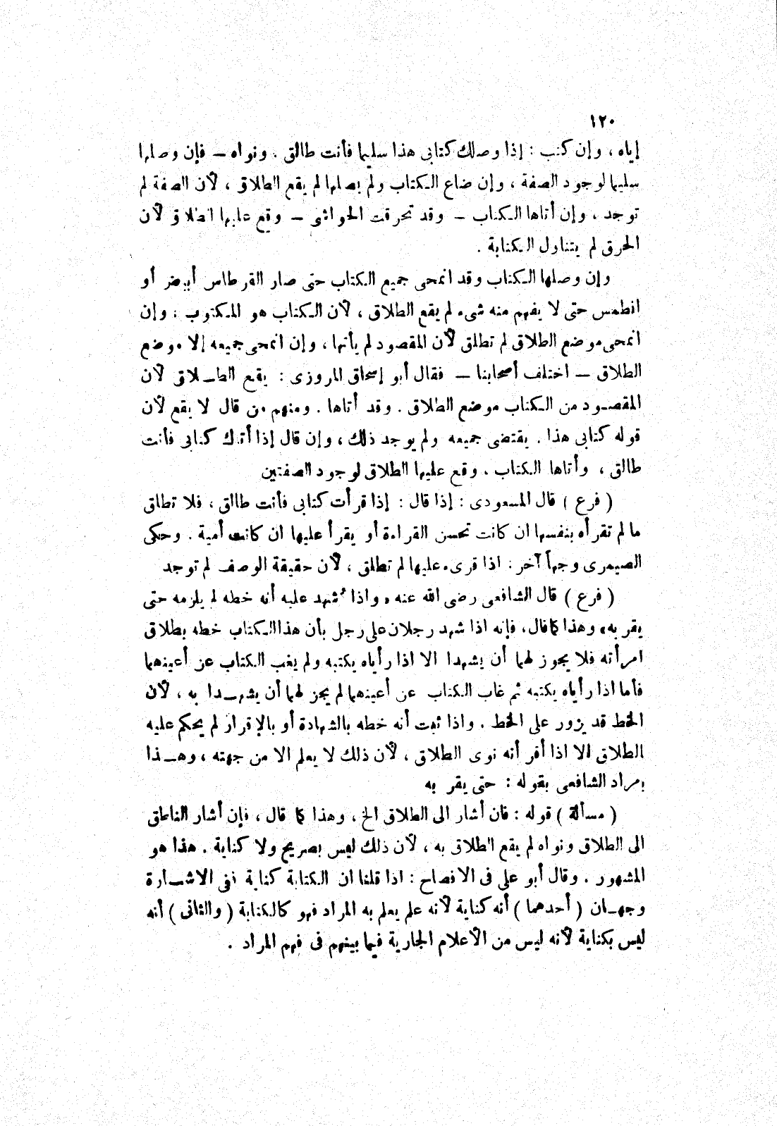 قال المسعودي: إذا قال: إذا قرأت كتابي فأنت طالق، فلا تطلق ما لم تقرأه بنفسها ان كانت تحسن القراءة أو يقرأ عليها ان كانت أمية.