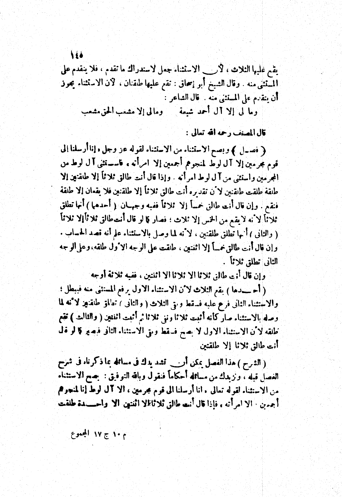 ويصح الاستثناء من الاستثناء لقوله عز وجل " إنا أرسلنا إلى قوم مجرمين إلا آل لوط لمنجوهم أجمعين إلا امرأته " فاستثنى آل لوط من المجرمين واستثنى من آل لوط امرأته.