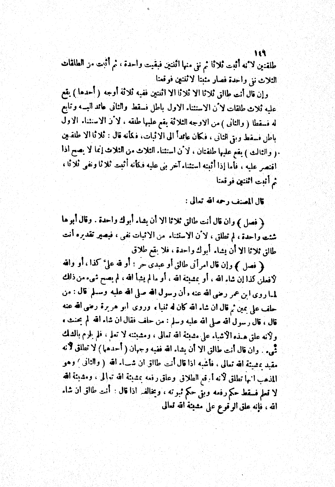 وإن قال امرأتي طالق أو عبدى حر، أو لله على كذا، أو والله لافعلن كذا إن شاء الله، أو بمشيئة الله، أو ما لم يشأ الله، لم يصح شئ من ذلك لما روى ابْنِ عُمَرَ رَضِيَ اللَّهُ عَنْهُ " أَنَّ رَسُولَ اللَّهِ صَلَّى اللَّهُ عَلَيْهِ وَسَلَّمَ قَالَ: مَنْ حلف على يمين ثم قال ان شاء الله كان له ثنيا " وروى أَبُو هُرَيْرَةَ رَضِيَ اللَّهُ عَنْهُ قَالَ، قَالَ رَسُولُ الله صلى الله عليه وسلم: من حلف فقال ان شاء الله لم يحنث " ولانه علق هذه الاشياء على مشيئة الله تعالى، ومشيئته لا تعلم، فلم يلزم بالشك