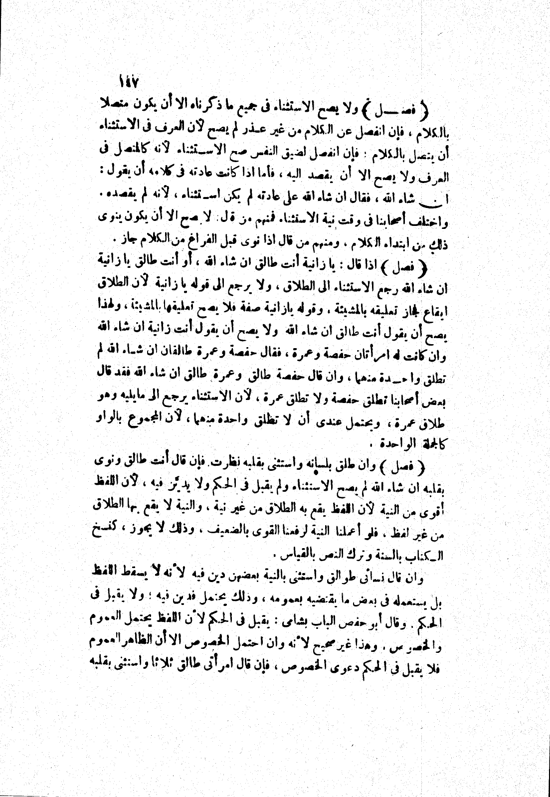وقال أبو حفص الباب بشامي: يقبل في الحكم لان اللفظ يحتمل العموم والخصوص، وهذا غير صحيح لانه وان احتمل الخصوص الا أن الظاهر العموم فلا يقبل في الحكم دعوى الخصوص، فإن قال امرأتي طالق ثلاثا واستثنى بقلبه