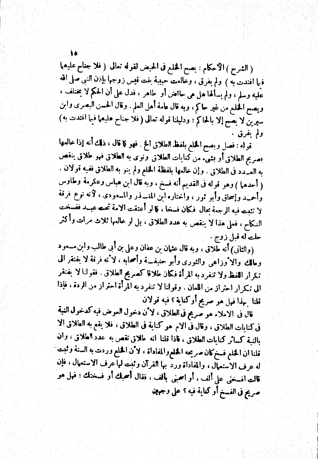 (الشرح) الاحكام: يصح الخلع في الحيض لقوله تعالى (فلا جناح عليهما فيما افتدت به) ولم يفرق، وخالعت حبيبة بنت قيس زوجها بإذن النبي صلى الله عليه وسلم، ولم يسألها هل هي حائض أو طاهر، فدل على أن الحكم لا يختلف، ويصح الخلع من غير حاكم، وبه قال عامة أهل العلم.