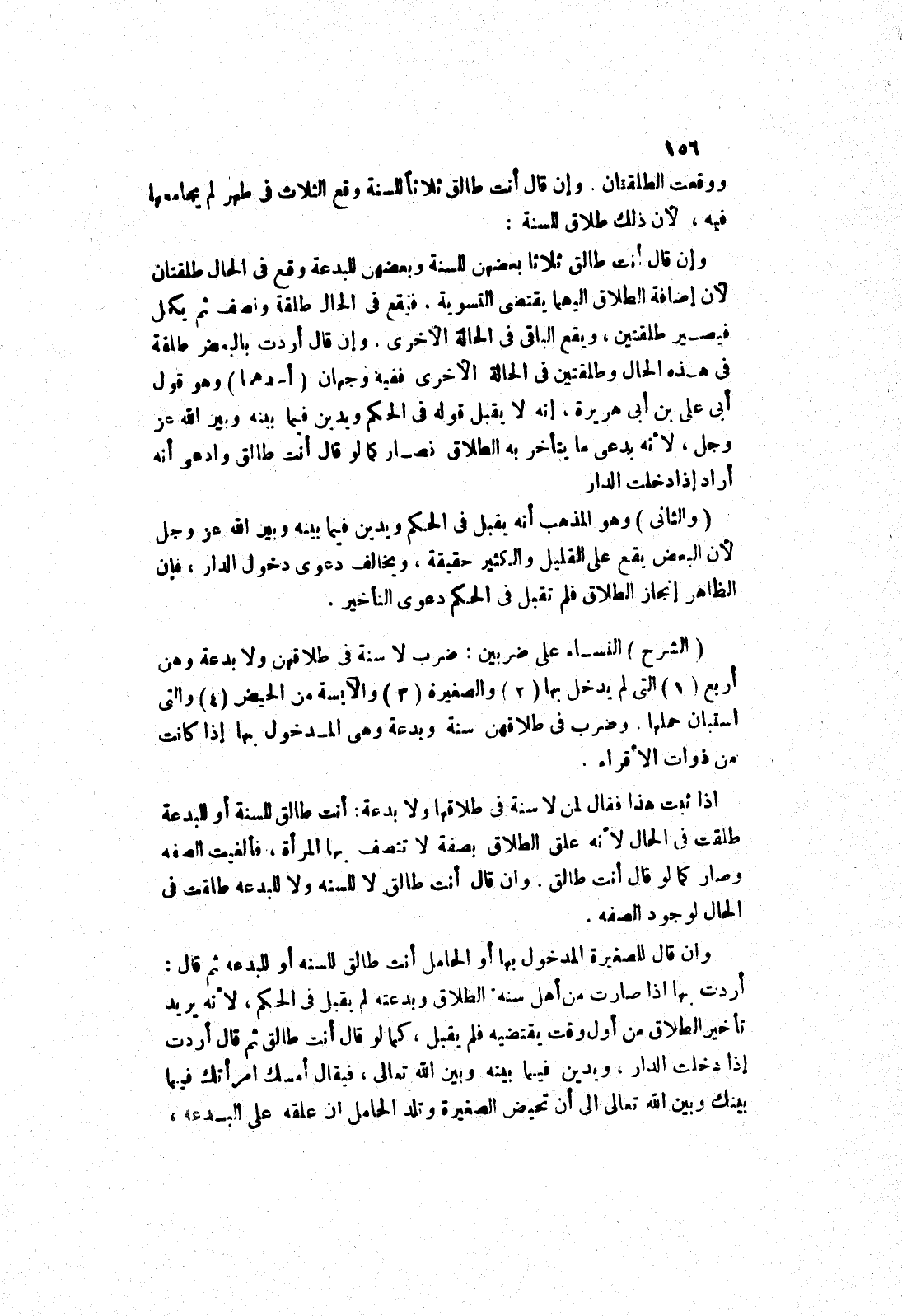 (الشرح) النساء على ضربين: ضرب لا سنة في طلاقهن ولا بدعة وهن أربع (1) التى لم يدخل بها (2) والصغيرة (3) والآيسة من الحيض (4) والتى استبان حملها.