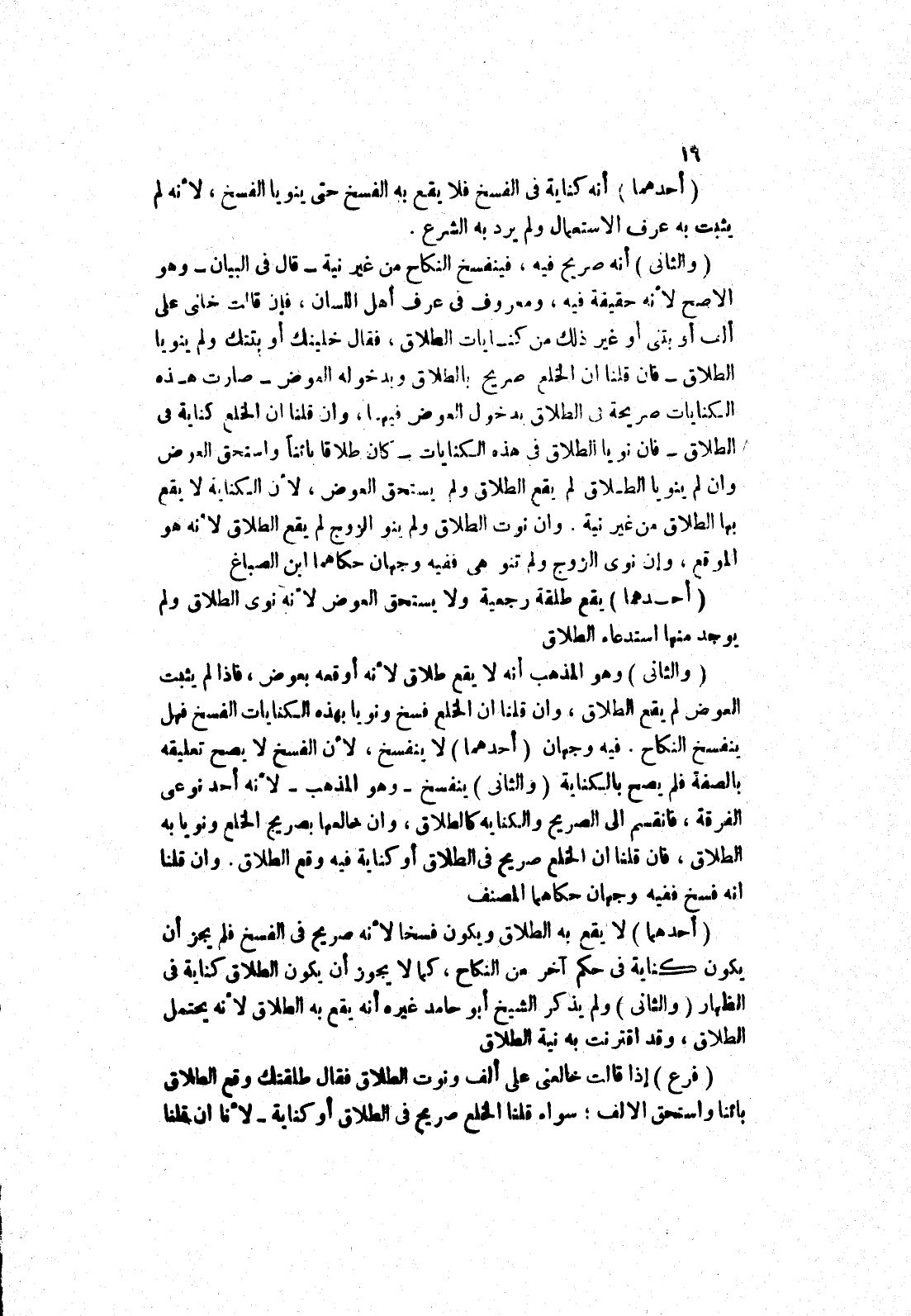 أنه صريح فيه، فينفسخ النكاح من غير نية - قال في البيان - وهو الاصح لانه حقيقة فيه، ومعروف في عرف أهل اللسان، فإن قالت خلنى على ألف أو بتنى أو غير ذلك من كنايات الطلاق، فقال خليتك أو بتتك ولم ينويا