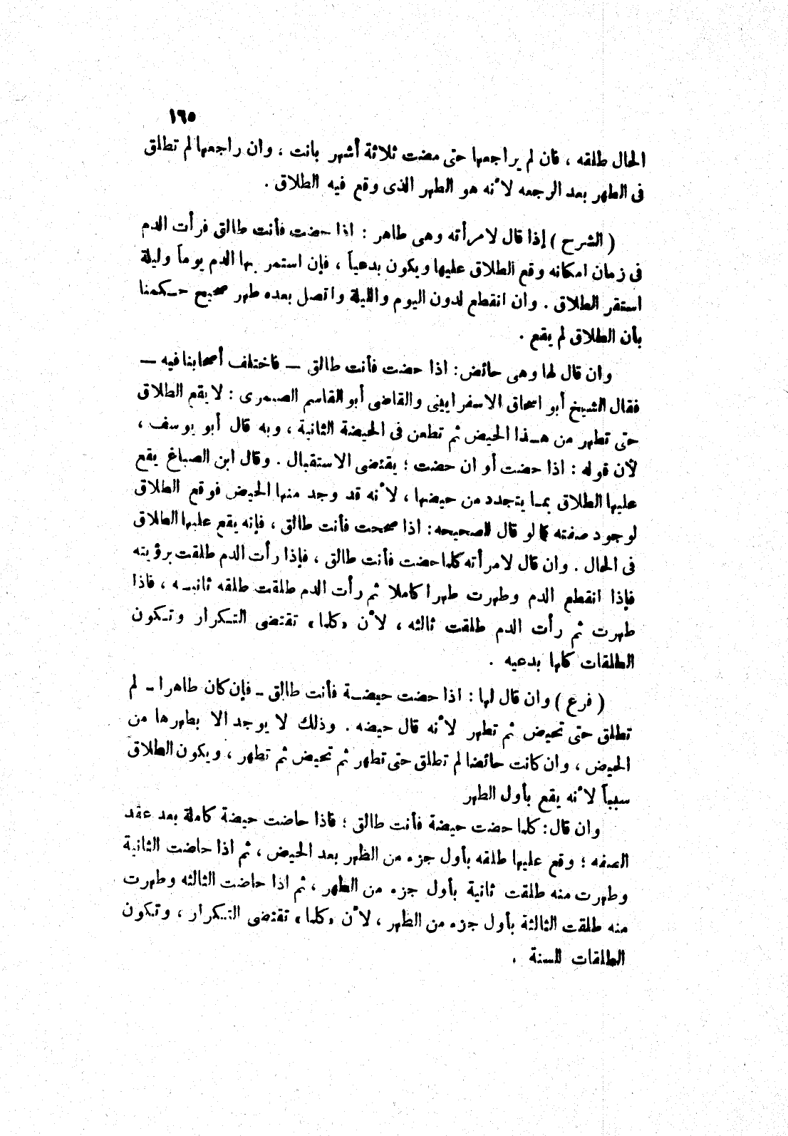 وذلك لا يوجد الا بطهرها من الحيض، وان كانت حائضا لم تطلق حتى تطهر ثم تحيض ثم تطهر، ويكون الطلاق سببا لانه يقع بأول الطهر وان قال: كلما حضت حيضة فأنت طالق، فإذا حاضت حيضة كاملة بعد عقد الصفه، وقع عليها طلقه بأول جزء من الظهر بعد الحيض، ثم إذا حاضت الثانية وطهرت منه طلقت ثانية بأول جزء من الطهر، ثم إذا حاضت الثالثه وطهرت منه طلقت الثالثة بأول جزء من الطهر، لان " كلما " تقتضي التكرار، وتكون الطلقات للسنة،
