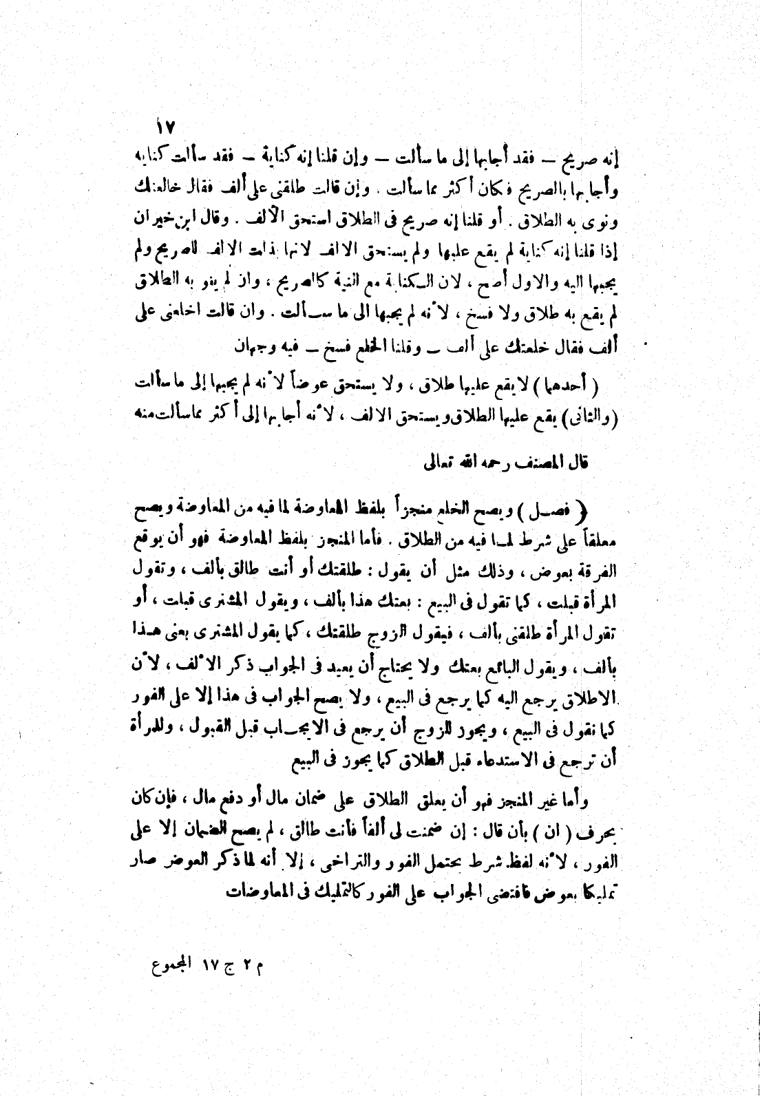 فأما المنجز بلفظ المعاوضة فهو أن يوقع الفرقة بعوض، وذلك مثل أن يقول: طلقتك أو أنت طالق بألف، وتقول المرأة قبلت، كما تقول في البيع: بعتك هذا بألف، يقول المشترى قبلت، أو تقول المرأة طلقني بألف، فيقول الزوج طلقتك، كما يقول المشترى بعنى هذا بألف، ويقول البائع بعتك ولا يحتاج أن يعيد في الجواب ذكر الالف، لان الاطلاق يرجع إليه كما يرجع في البيع، ولا يصح الجواب في هذا إلا على الفور كما نقول في البيع، ويجوز للزوج أن يرجع في الايجاب قبل القبول، وللمرأة أن ترجع في الاستدعاء قبل الطلاق كما يجوز في البيع وأما غير المنجز فهو أن يعلق الطلاق على ضمان مال أو دفع مال، فإن كان بحرف (ان) بأن قال: إن ضمنت لى ألفا فأنت طالق، لم يصح الضمان إلا على الفور، لانه لفظ شرط يحتمل الفور والتراخى، إلا أنه لما ذكر العوض صار