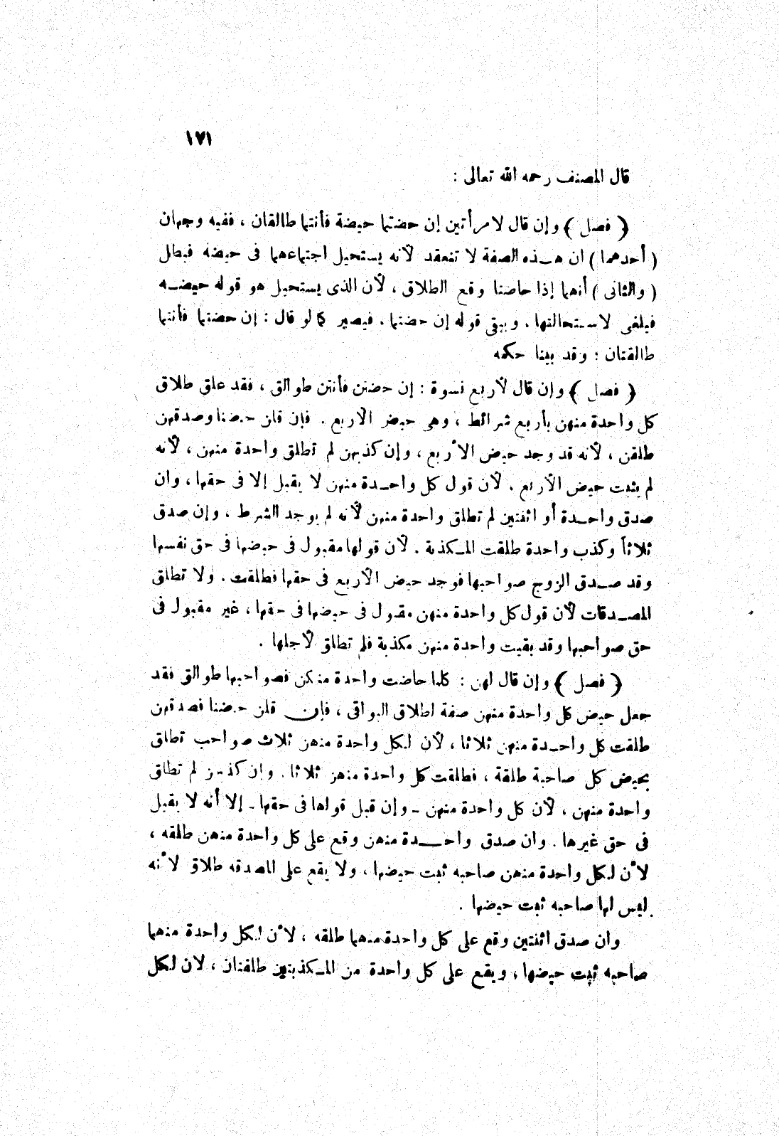 وان قال لاربع نسوة: إن حضتن فأنتن طوالق، فقد علق طلاق كل واحدة منهن بأربع شرائط، وهى حيض الاربع.