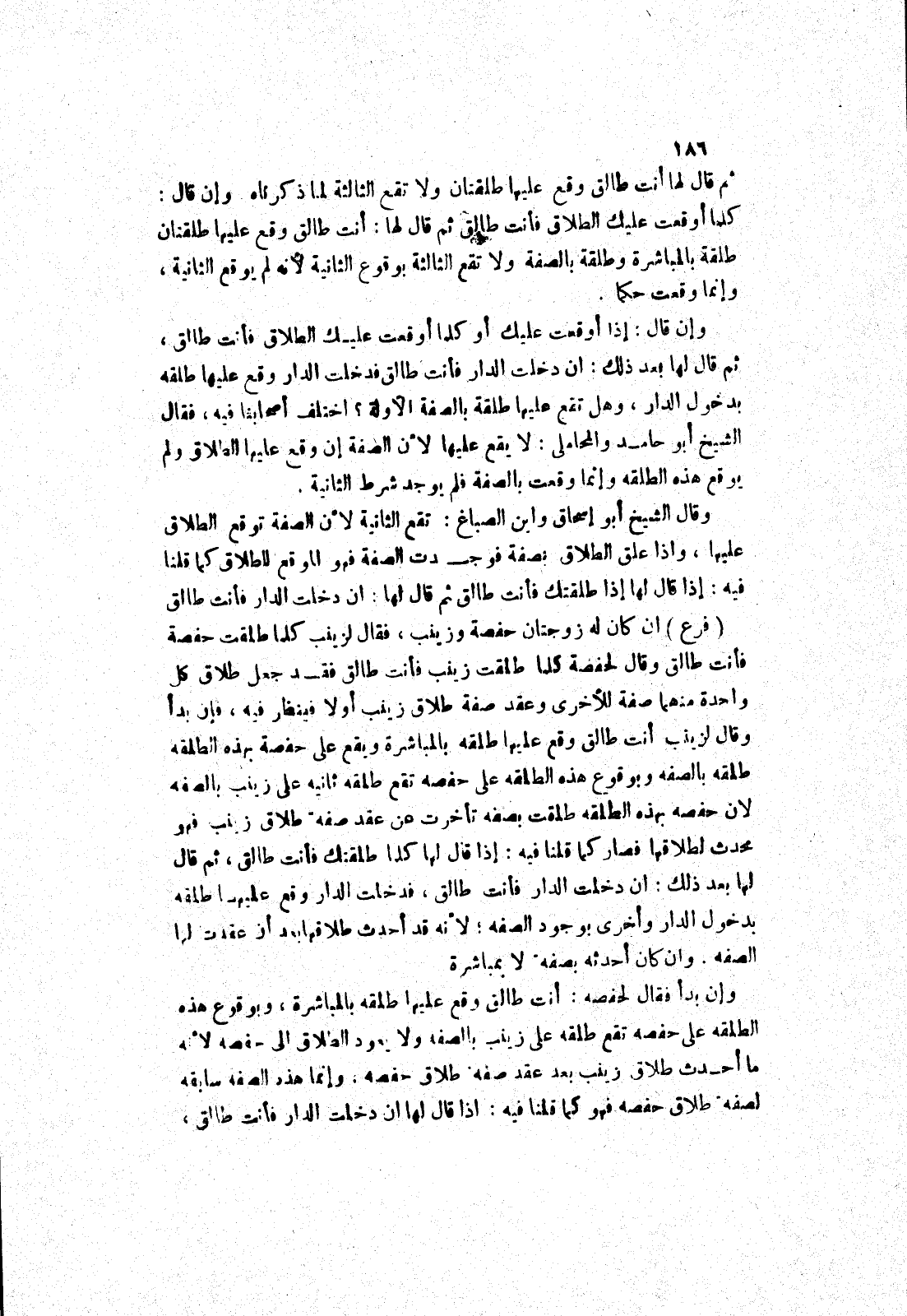 ان كان له زوجتان حفصة وزينب، فقال لزينب كلما طلقت حفصة فأنت طالق وقال لحفصة كلما طلقت زينب فأنت طالق فقد جعل طلاق كل واحدة منهما صفة للاخرى وعقد صفة طلاق زينب أولا فينظر فيه، فإن بدأ وقال لزينب أنت طالق وقع عليها طلقه بالمباشرة ويقع على حفصة بهذه الطلقه طلقه بالصفة وبوقوع هذه الطلقه على حفصه تقع طلقه ثانيه على زينب بالصفة لان حفصه بهذه الطلقه طلقت بصفة تأخرت عن عقد صفة طلاق زينب فهو محدث لطلاقها فصار كما قلنا فيه: إذا قال لها كلما طلقتك فأنت طالق، ثم قال لها بعد ذلك: ان دخلت الدار فأنت طالق، فدخلت الدار وقع عليها طلقه بدخول الدار وأخرى بوجود الصفه، لانه قد أحدث طلاقها بعد أن عقدت لها الصفه.