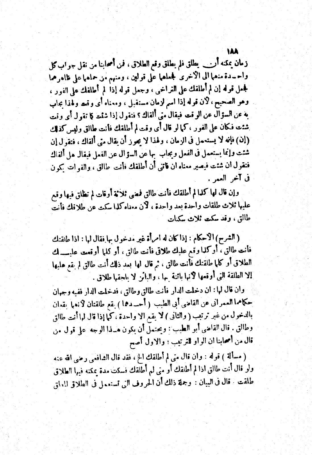 زمان يمكنه أن يطلق فلم يطلق وقع الطلاق، فمن أصحابنا من نقل جواب كل واحدة منهما إلى الاخرى فجعلهما على قولين، ومنهم من حملهما على ظاهرهما فجعل قوله إن لم أطلقك على التراخي، وجعل قوله إذا لم أطلقك على الفور، وهو الصحيح، لان قوله إذا اسم لزمان مستقبل، ومعناه أي وقت ولهذا يجاب به عن السؤال عن الوقت فيقال متى ألقاك؟ فتقول إذا شئت كما تقول أي وقت شئت فكان على الفور، كما لو قال أي وقت لم أطلقك فأنت طالق وليس كذلك (إن) فإنه لا يستعمل في الزمان، ولهذا لا يجوز أن يقال متى ألقاك، فتقول إن شئت وإنما يستعمل في الفعل ويجاب بها عن السؤال عن الفعل فيقال هل ألقاك فنقول ان شئت فيصير معناه ان فاتني أن أطلقك فأنت طالق، والفوات يكون في آخر العمر.